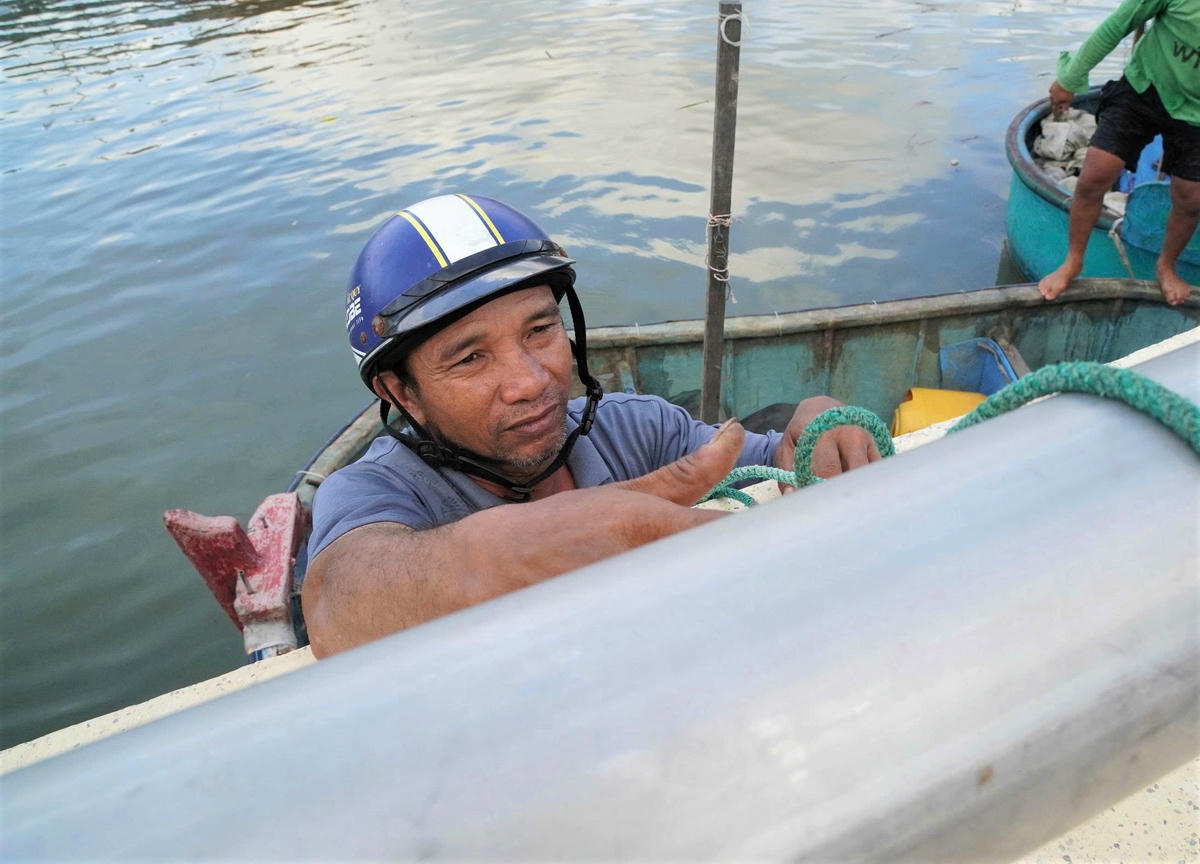 Ngư dân Nguyễn Minh Nhật đang cột dây neo cố định tàu thuyền tại cảng Quy Nhơn. Ảnh: T.Thành.