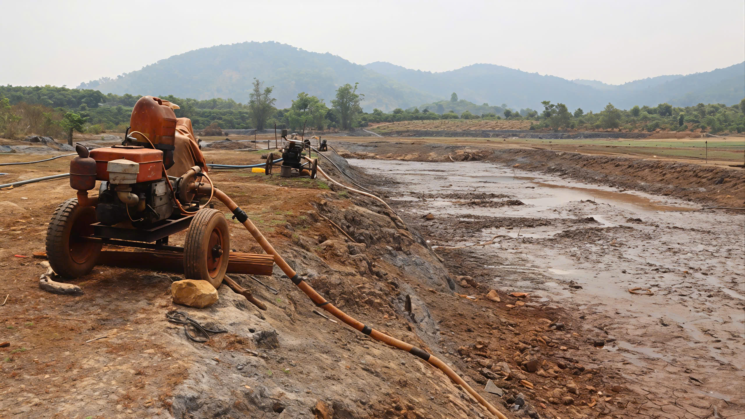 Máy bơm nằm chờ nước. Ảnh: HỮU PHÚC