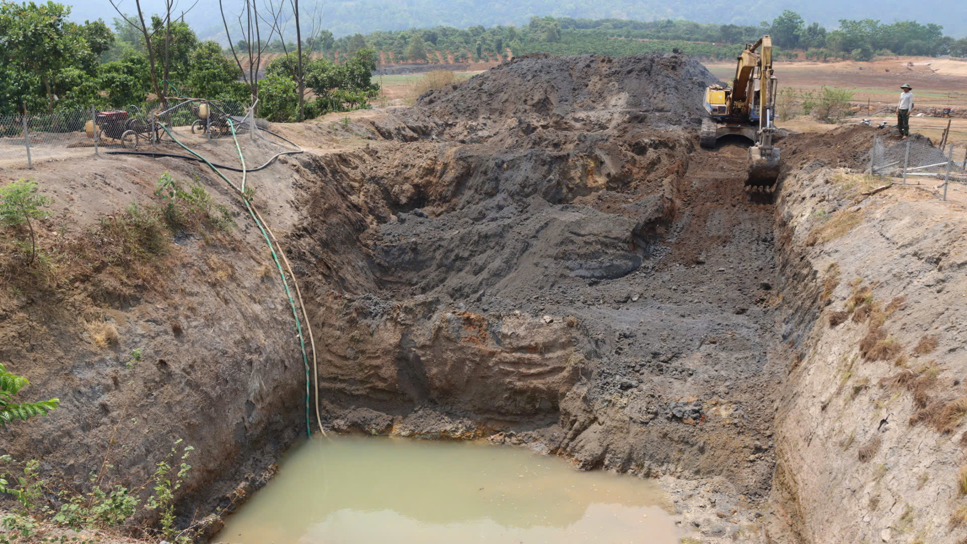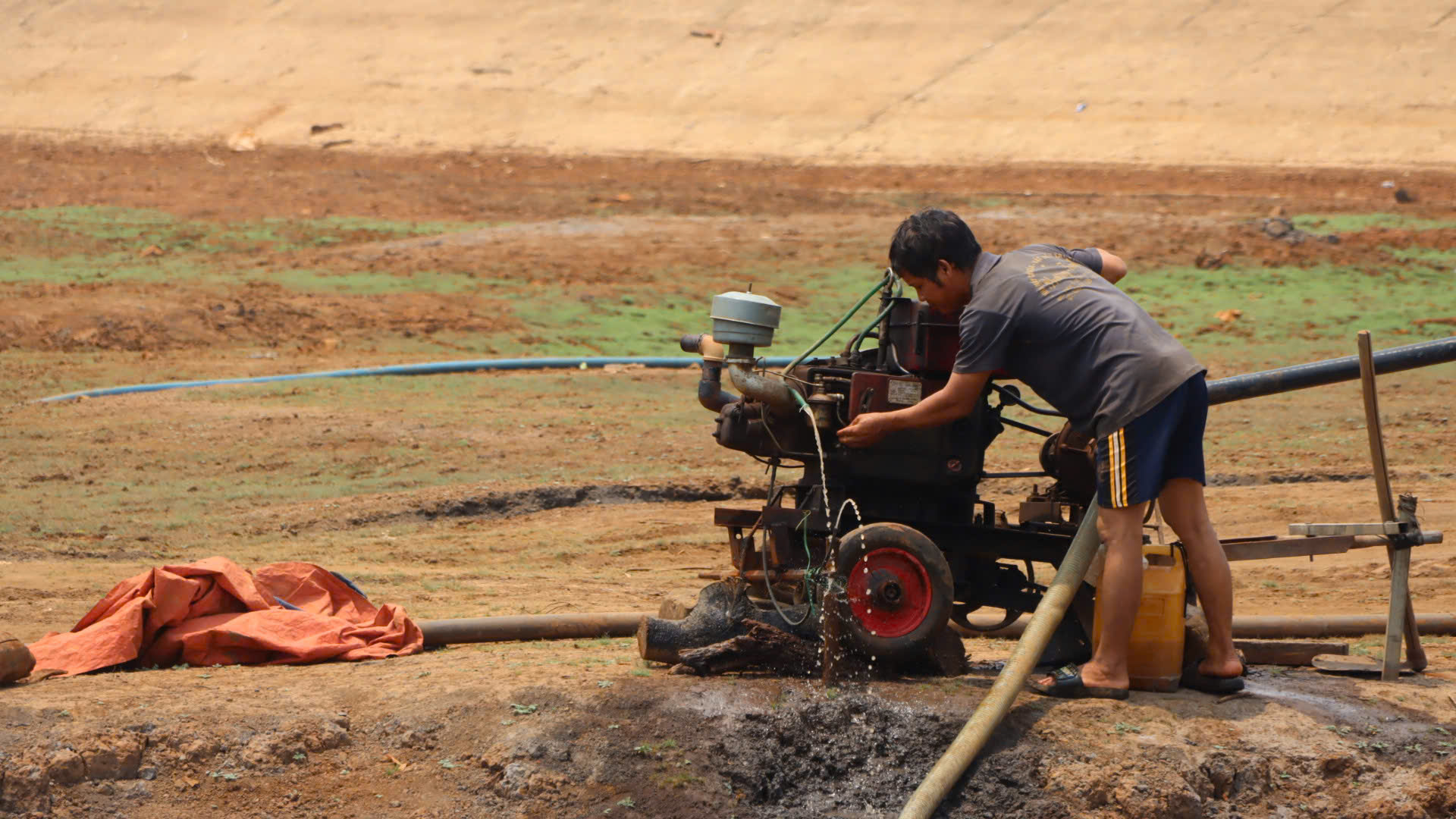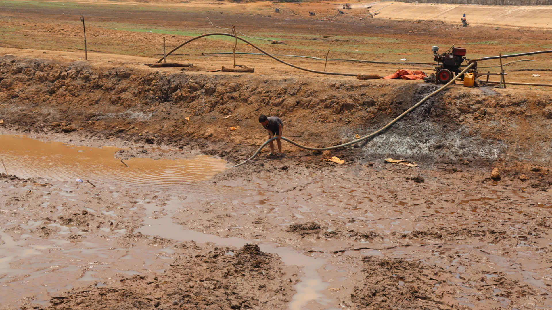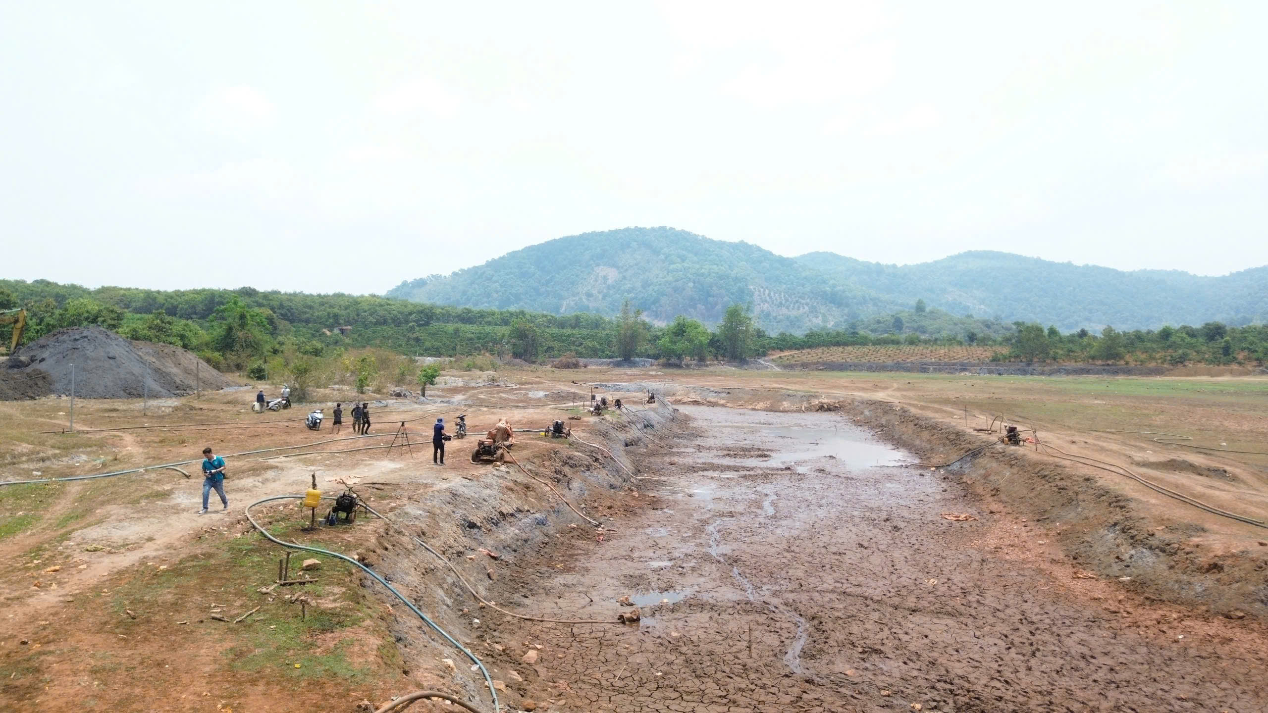 Tương tự, nhiều hộ dân quanh hồ cũng tất bật tìm nước. Có hộ bỏ hàng chục triệu đồng thuê máy múc đào sâu lòng hồ với hy vọng chạm được mạch nước ngầm. Tiếng máy nổ vang rền, từng gàu đất được xúc lên trong sự sốt ruột.