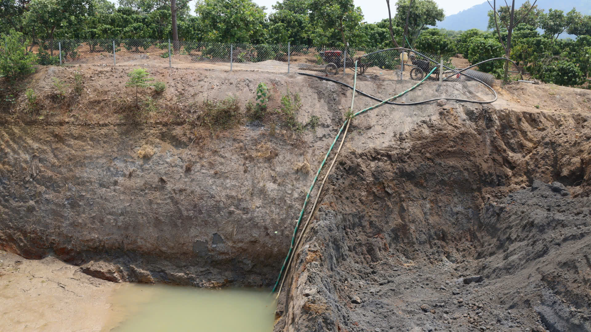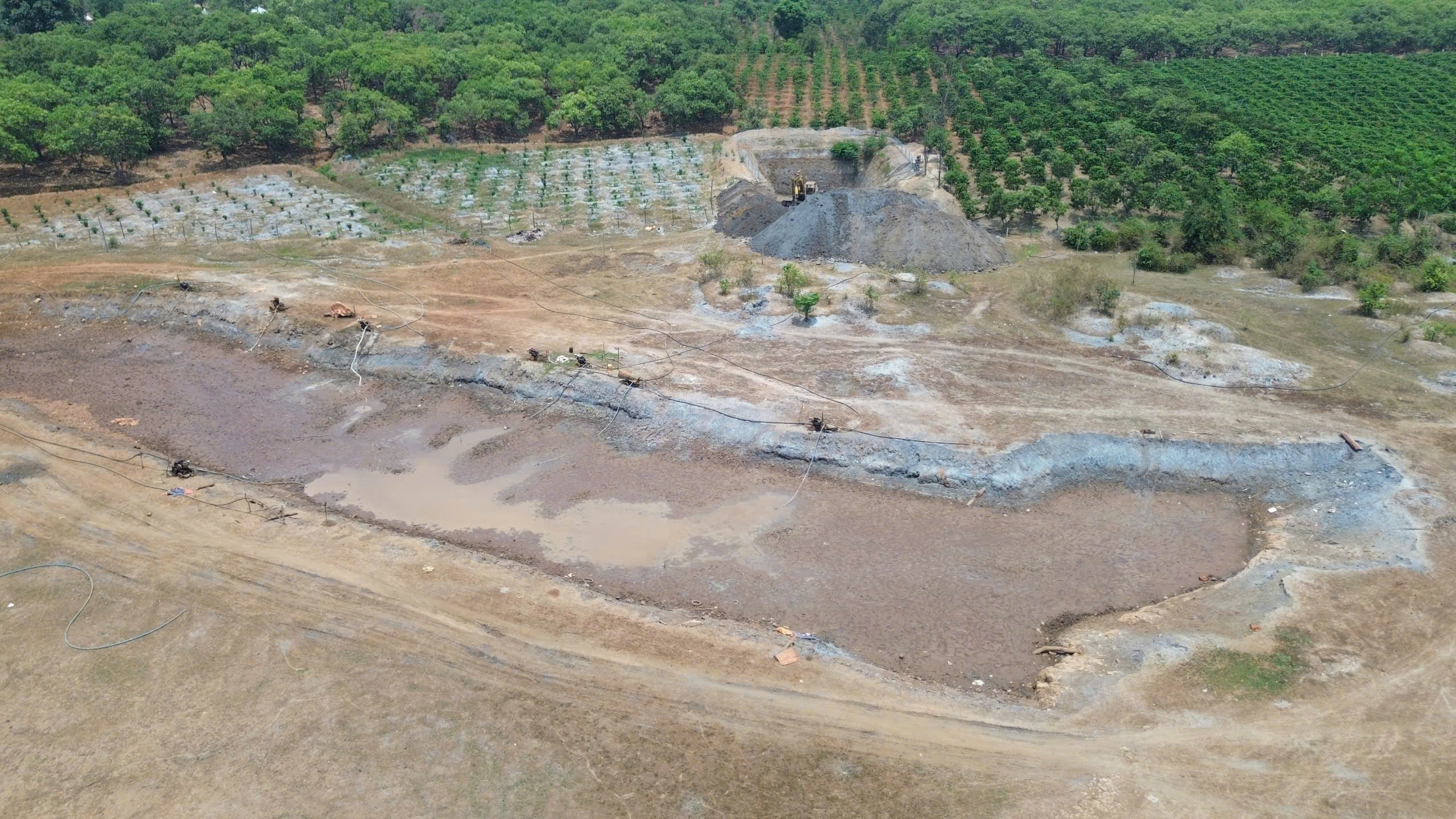 Do hồ cạn nước nên người dân phải chờ nước ngầm chảy ra để vét nước cứu cây. Ảnh: HỮU PHÚC