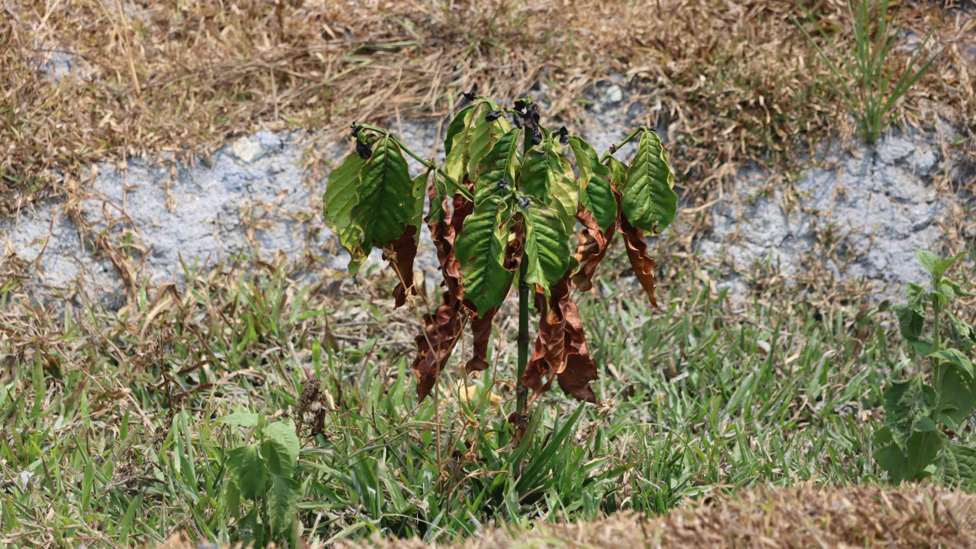 Xung quanh hồ De Chí, nhiều vườn cà phê đã xuất hiện tình trạng héo lá, đất đai khô cằn. Nếu tình trạng thiếu nước tiếp tục kéo dài, nguy cơ thiệt hại mùa vụ là khó tránh khỏi.