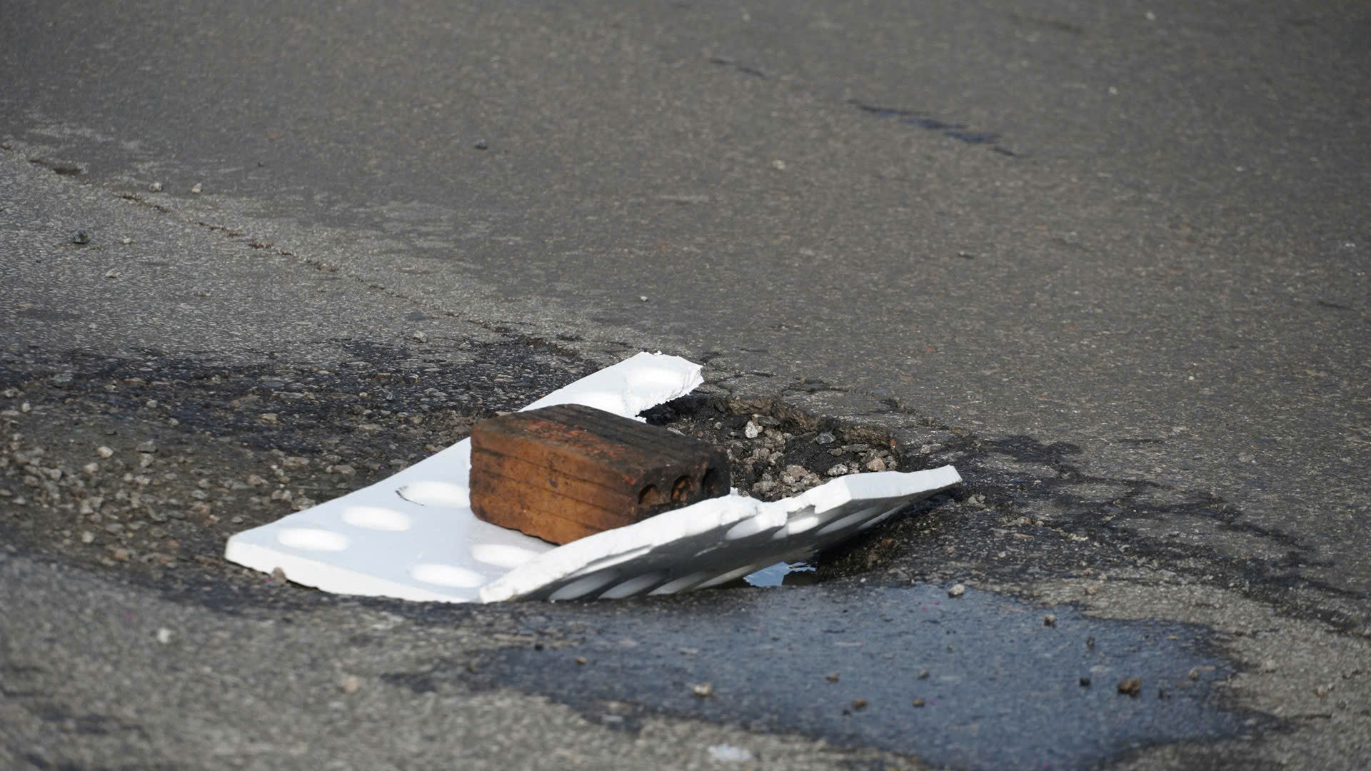 Người dân dùng các vật dụng cảnh báo các vị trí hư hỏng tại đường Tôn Đức Thắng (xã Biển Hồ). Ảnh: T.V.Y.