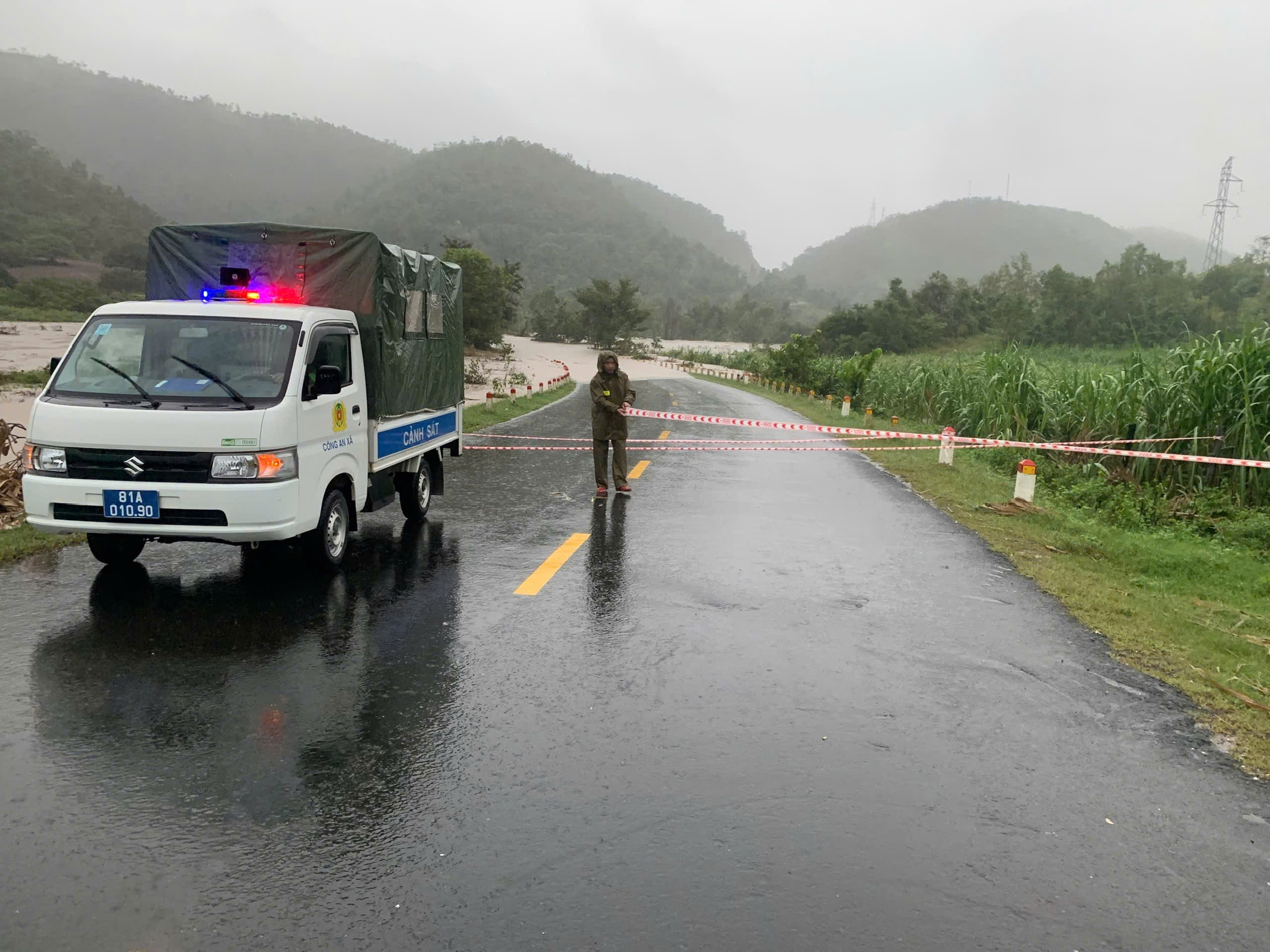 Lực lượng chức năng chốt chặn điểm ngập Quốc lộ 25 tại xã Uar