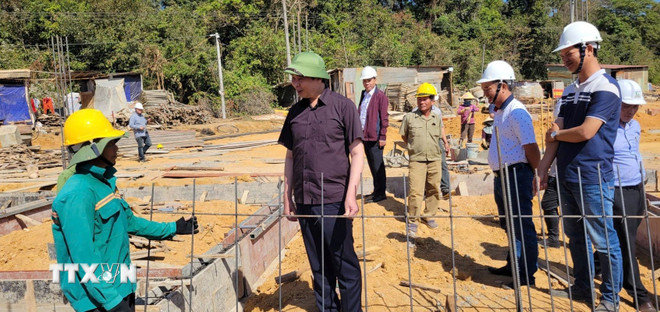Lãnh đạo tỉnh Gia Lai thăm hỏi, động viên công nhân tham gia thi công điểm trường xã Ia Púch. (Ảnh: Hoài Nam/TTXVN)