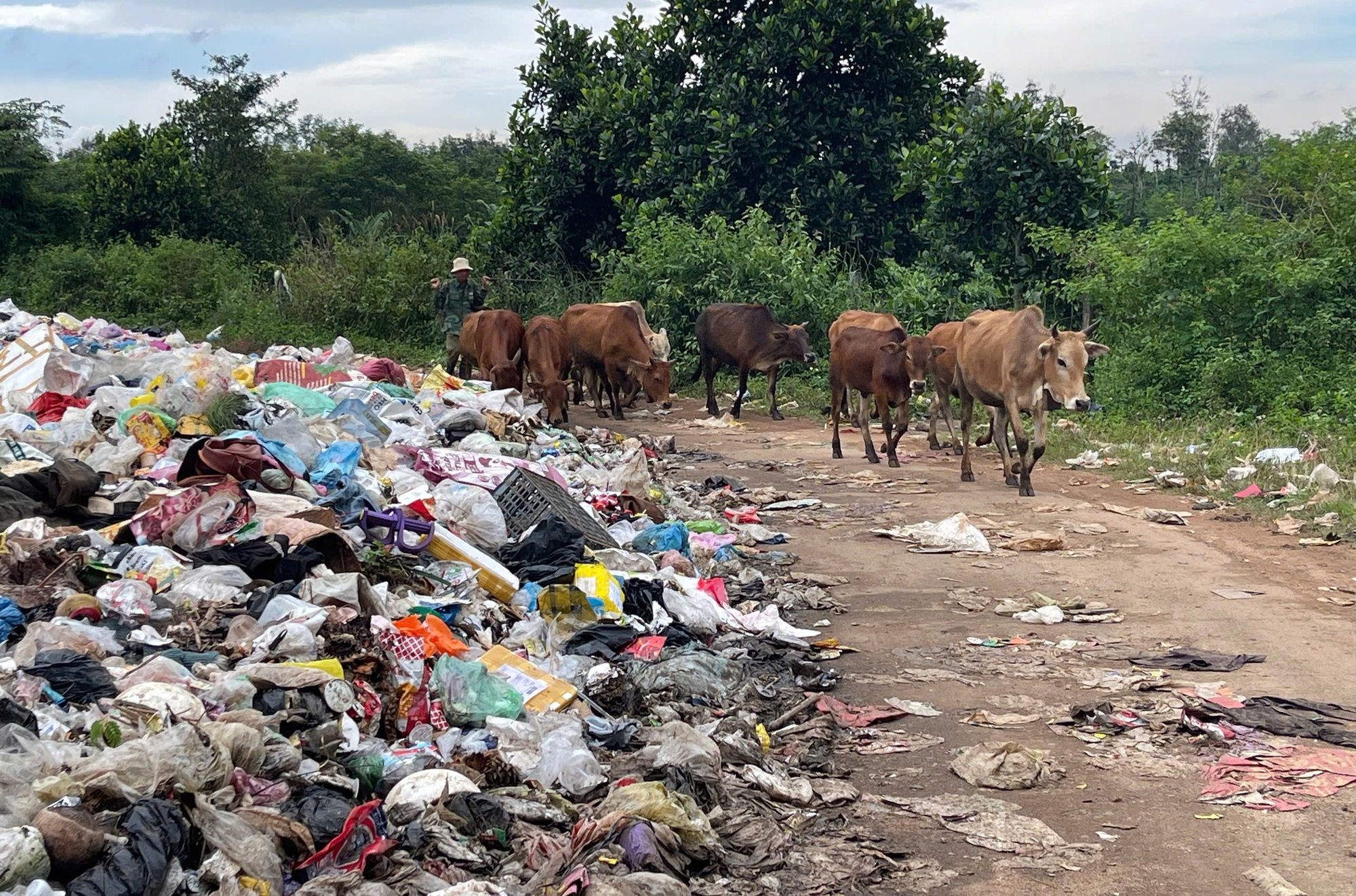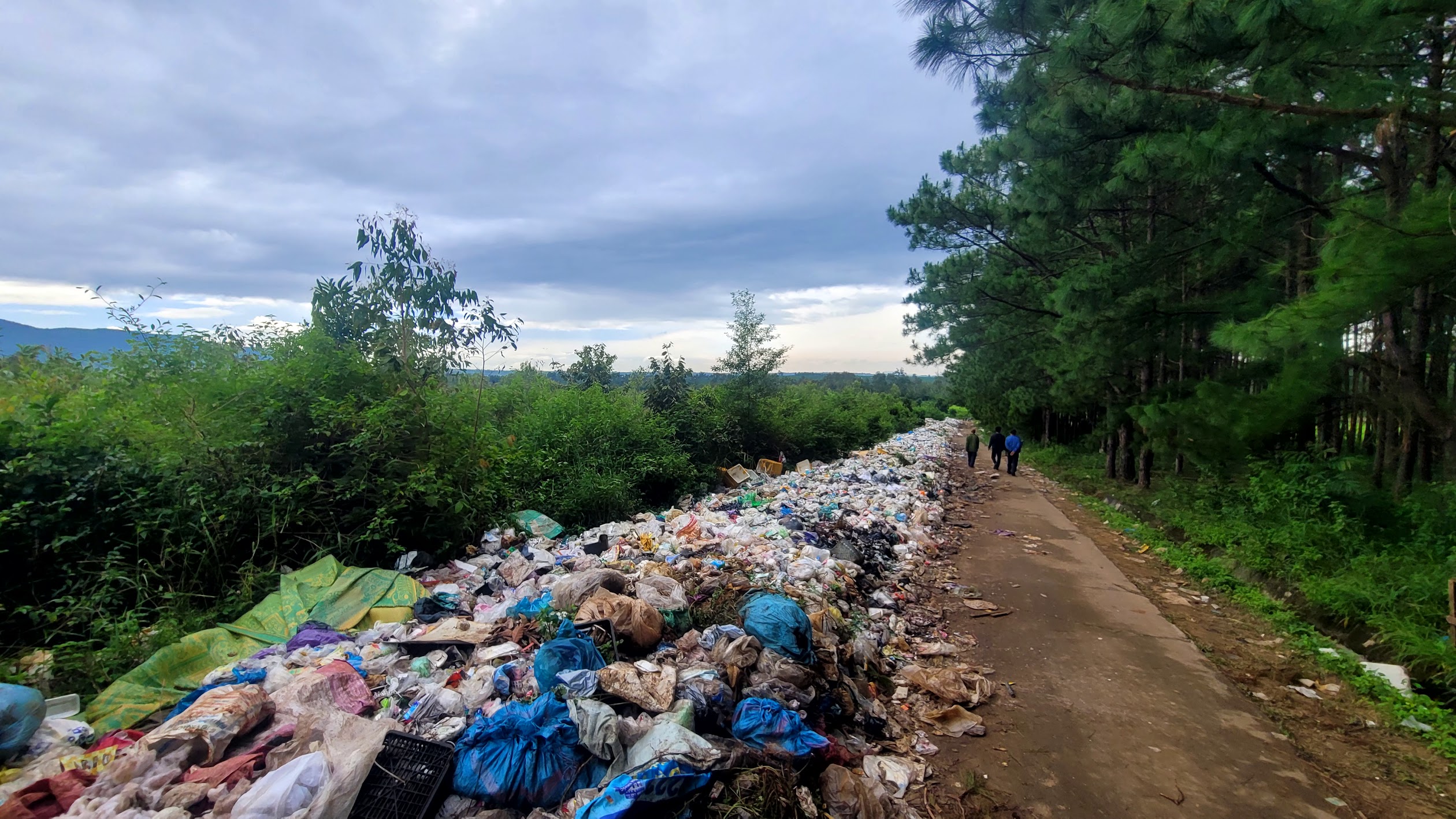 Rác đổ ngay lên mặt đường bê tông và chiếm khoảng 2/3 mặt đường với chiều dài khoảng 400m và nhiều vị trí khác xung quanh khu vực. Lượng rác rất lớn cùng với xác động vật phân hủy, sinh ruồi nhặng đã gây ô nhiễm môi trường nghiêm trọng.