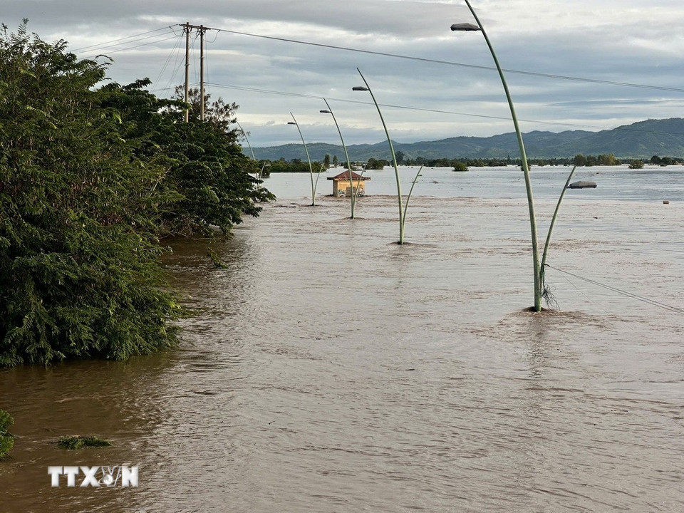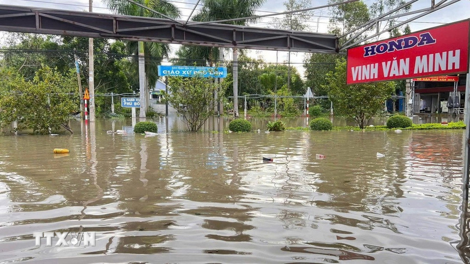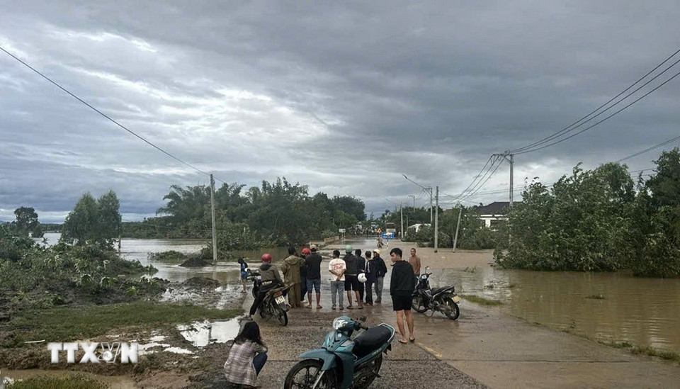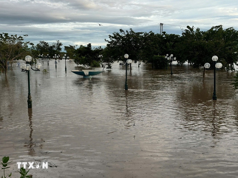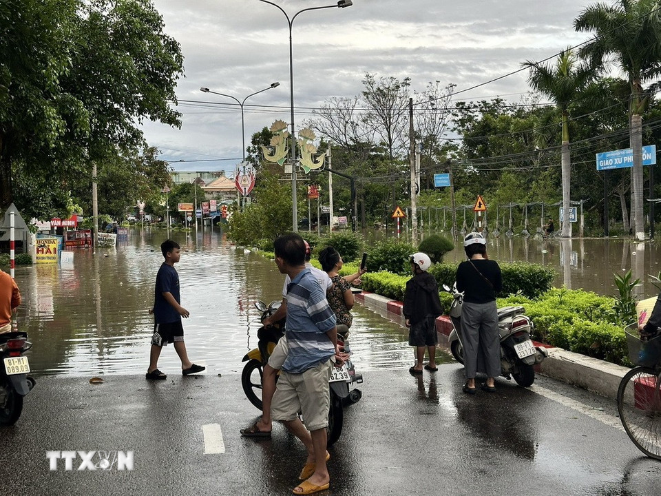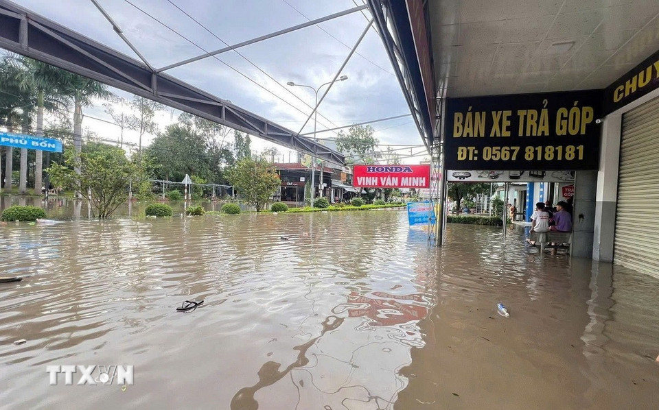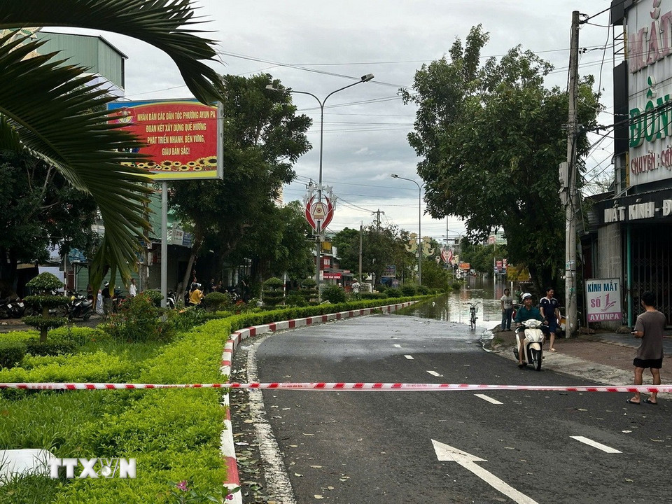 Tuyến đường tại phường Ayunpa (Gia Lai) bị ngập sâu trong nước. (Ảnh: Hoài Nam/TTXVN)