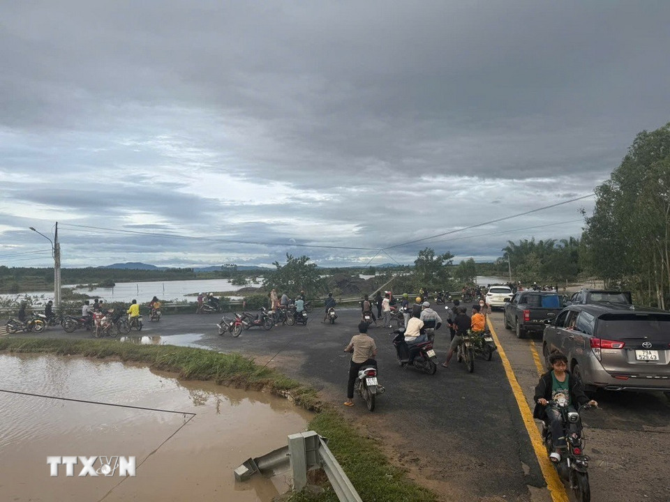 Mưa lớn làm sạt lở 20m đường dẫn vào cầu Kliếc (đoạn qua xã Pờ Tó, tỉnh Gia Lai), chia cắt giao thông đoạn xã Pờ Tó và xã Chơ Long đi Quốc lộ 19. (Ảnh: TTXVN phát)
