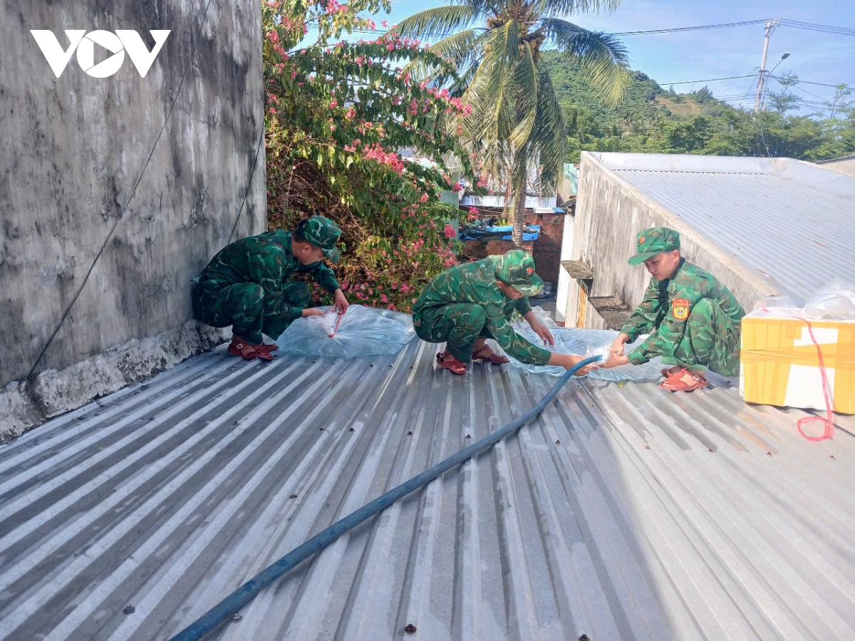 Các chiến sĩ biên phòng Đồn Biên phòng Cát Khánh hỗ trợ người dân chèn chống nhà cửa