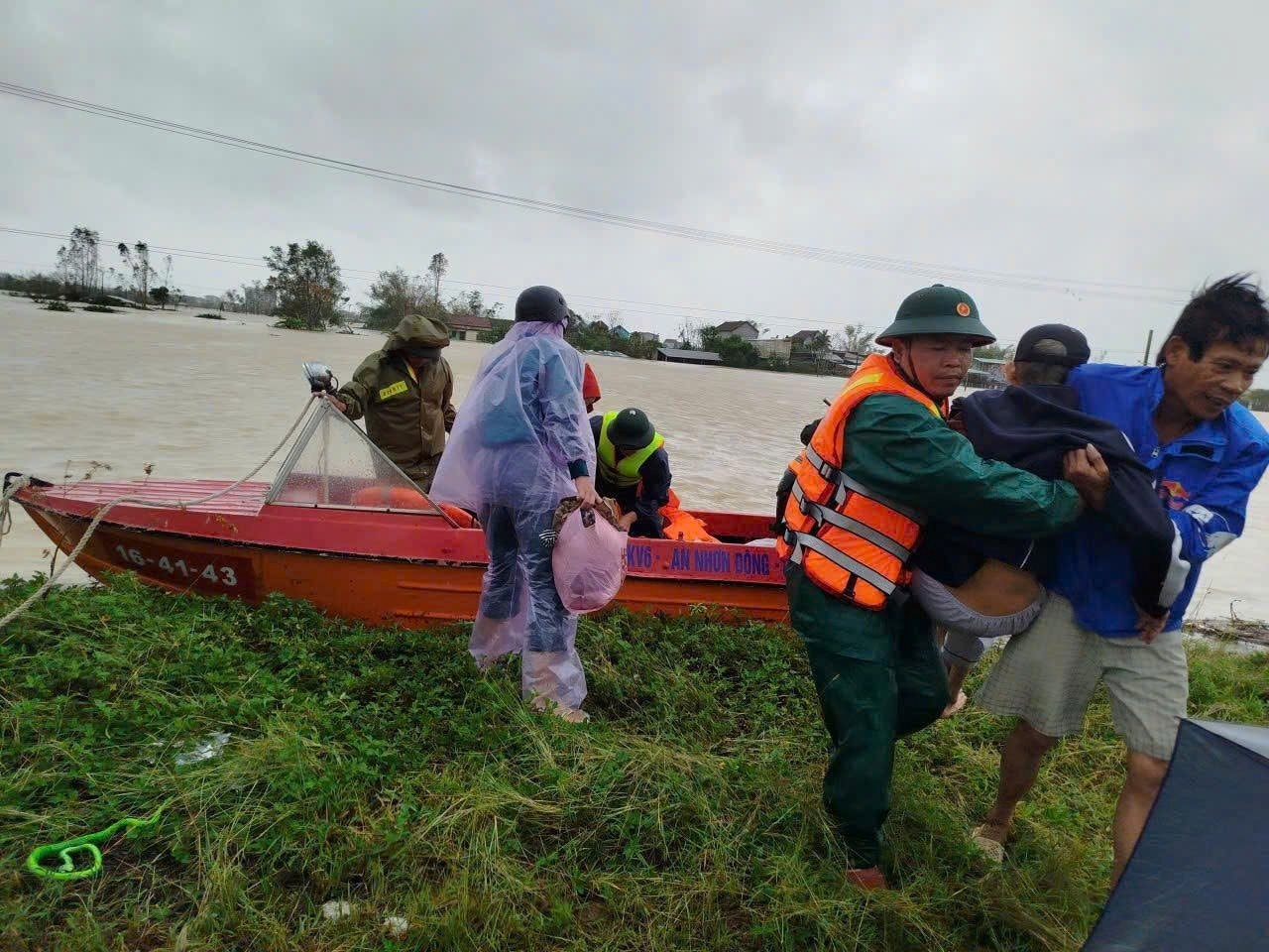 Lực lượng Ban Chỉ huy PTKV6 – An Nhơn Đông hỗ trợ người dân lên bờ an toàn sau khi được đưa ra khỏi khu vực ngập sâu.