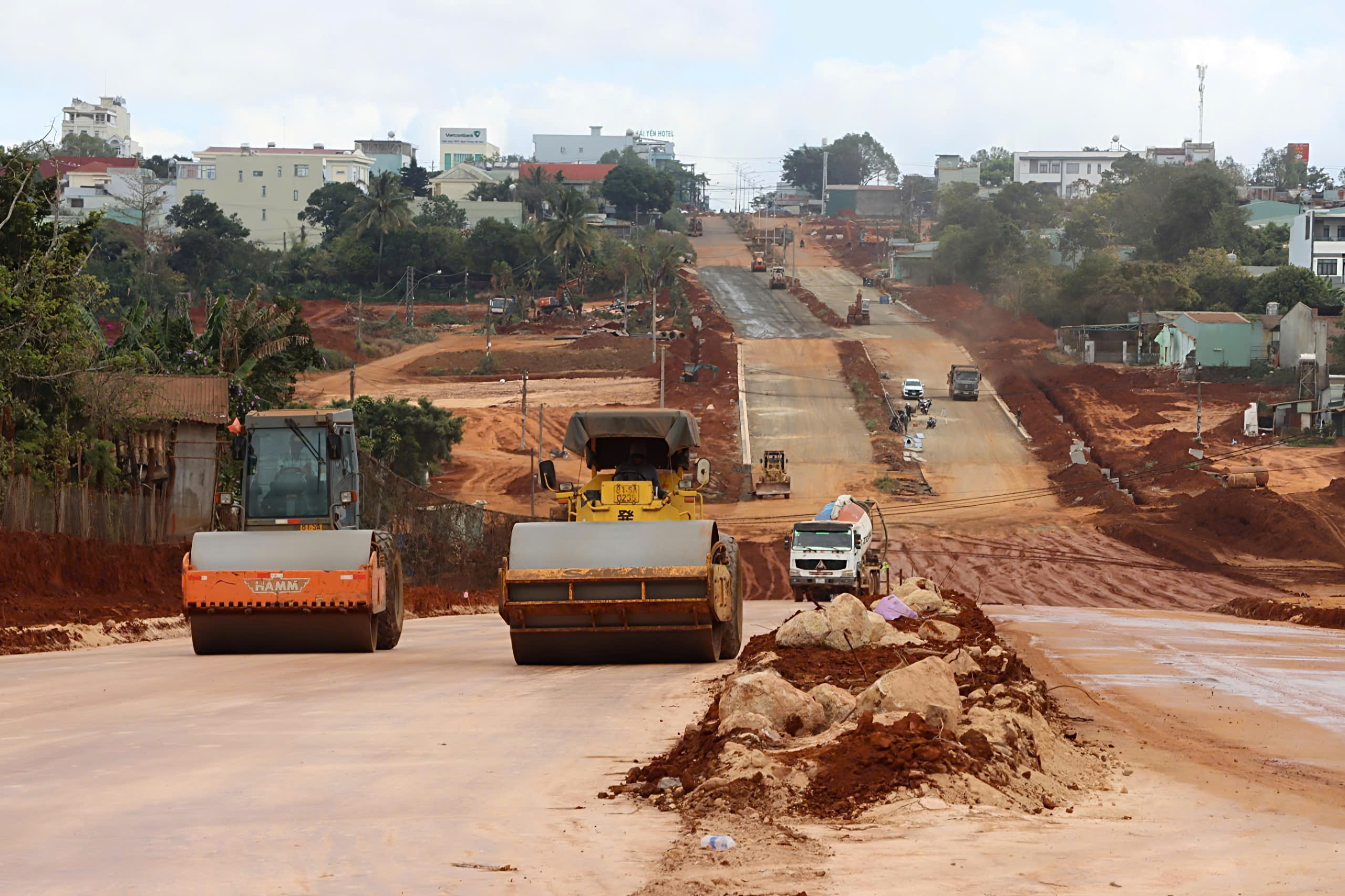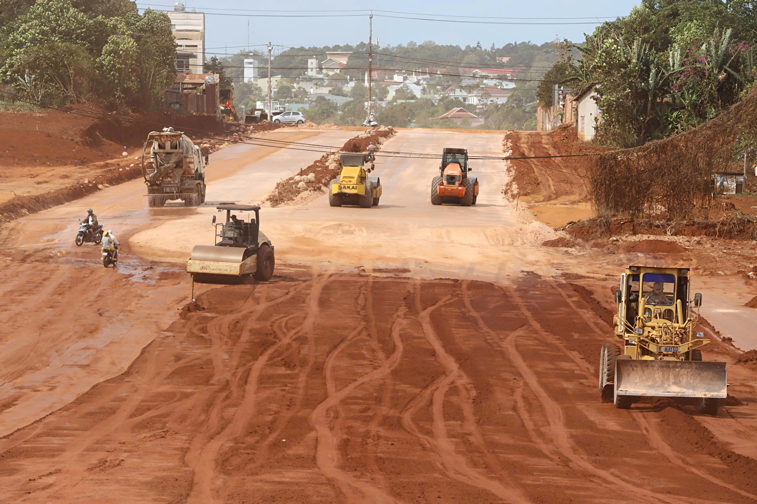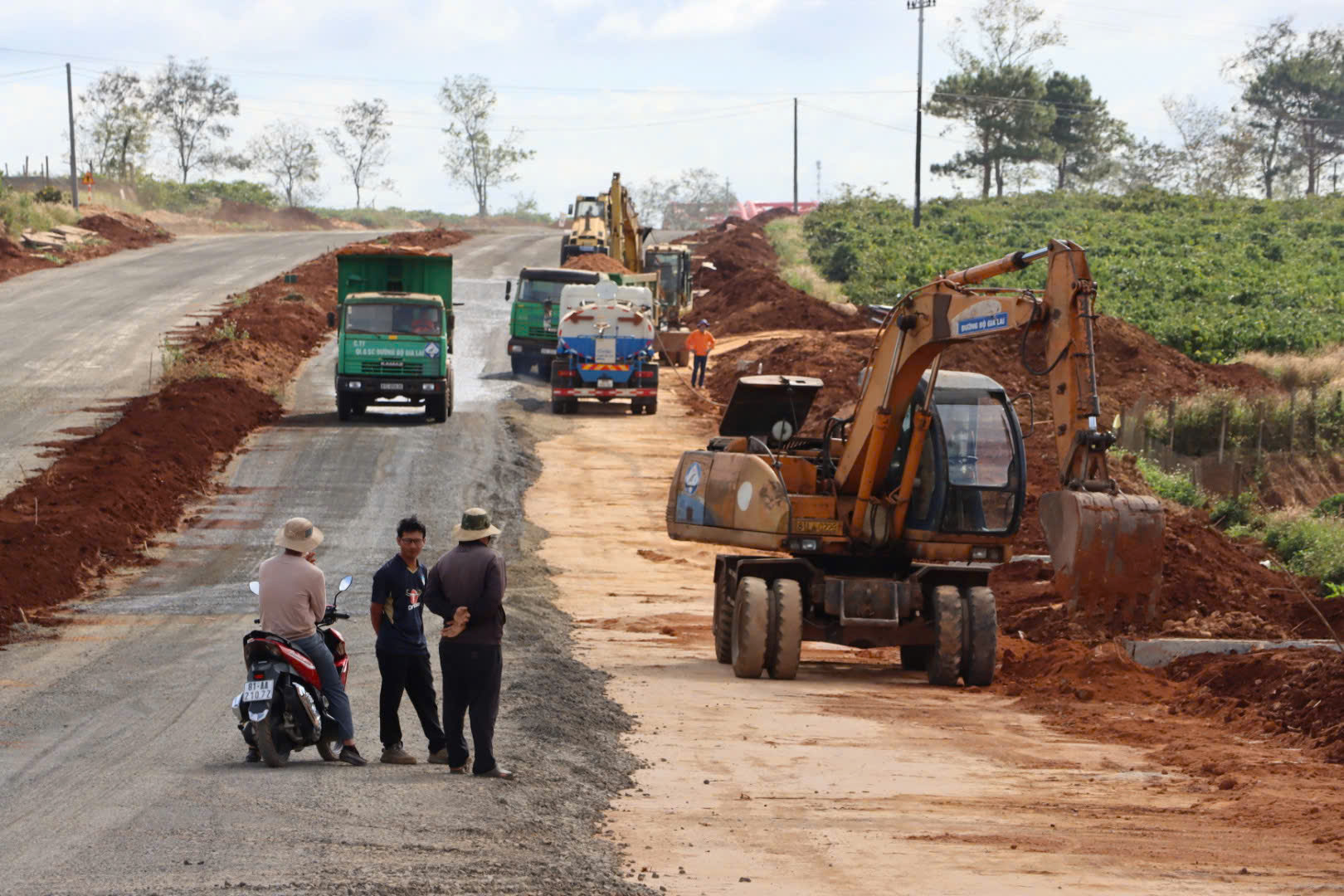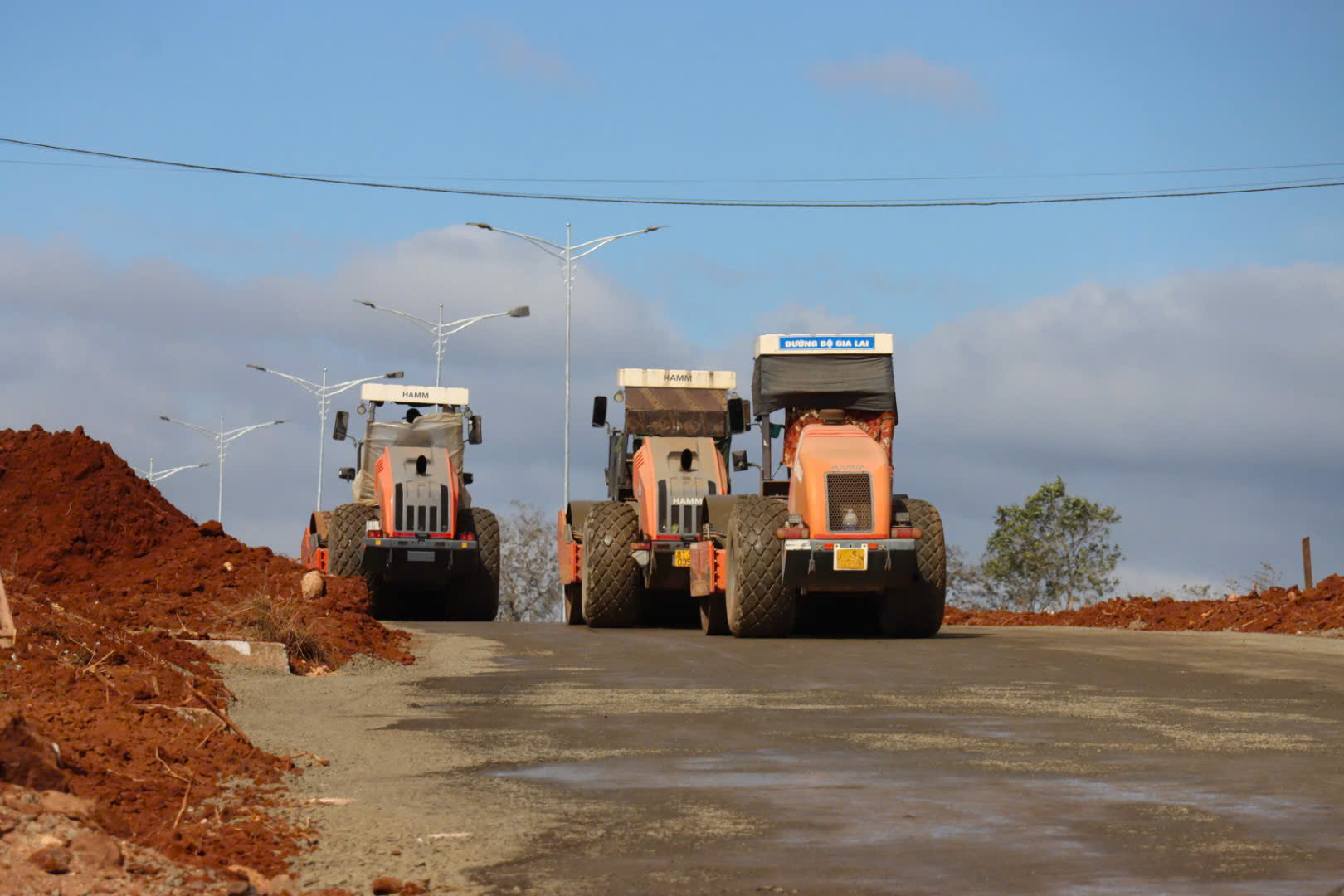 Xe lu lu nền ở Dự án đường hành lang kinh tế phía Đông Gia Lai. Ảnh: HỮU PHÚC