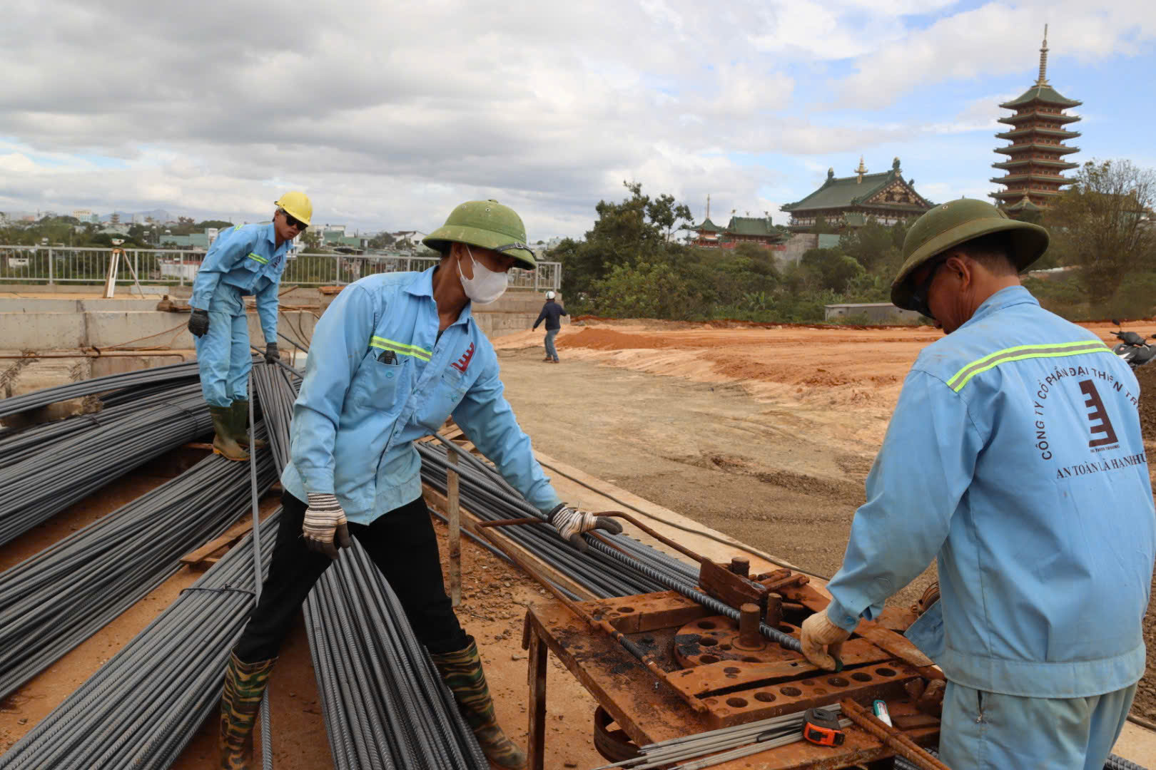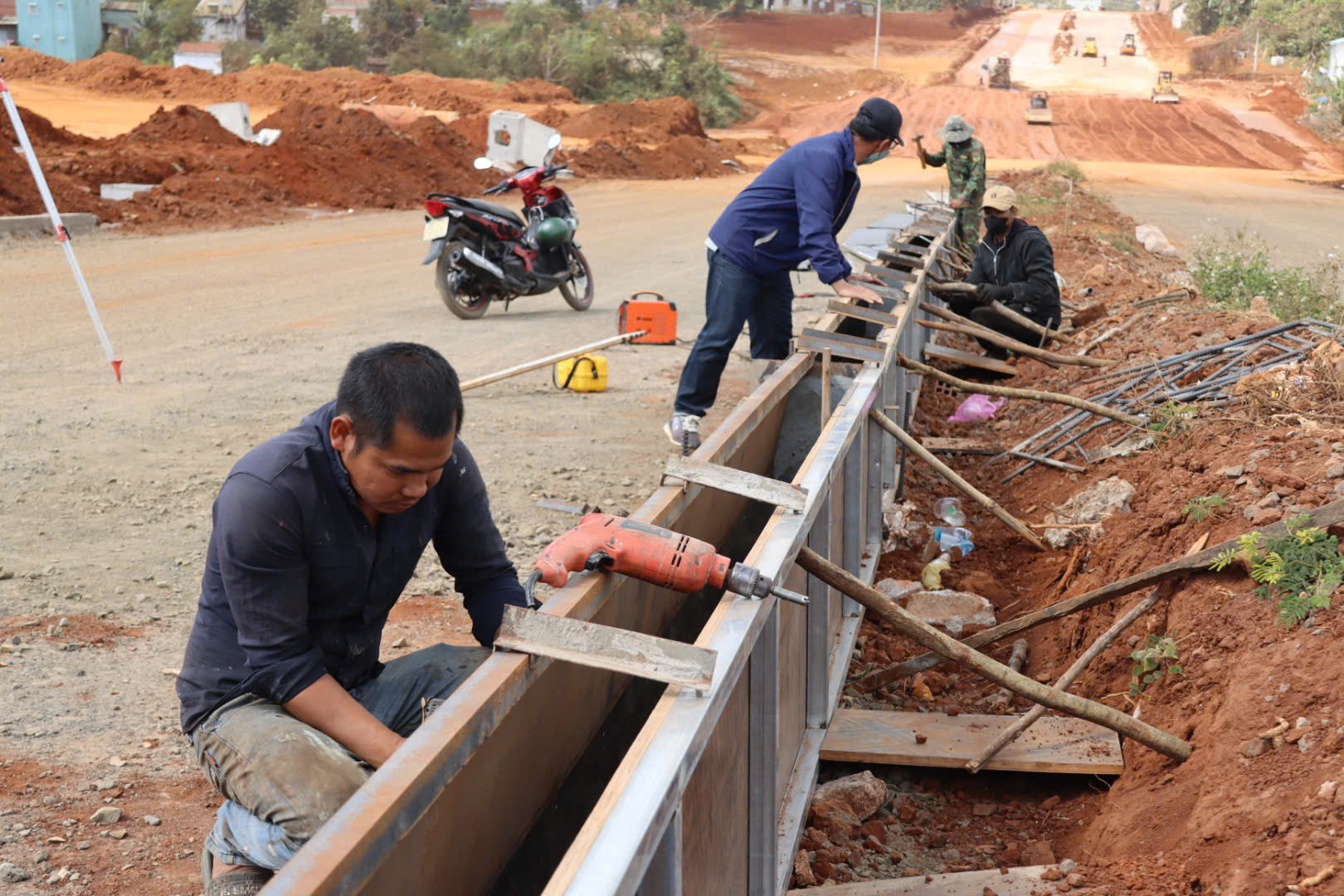 Công nhân làm hạng mục sắt ở Dự án đường hành lang kinh tế phía Đông Gia Lai. Ảnh: HỮU PHÚC