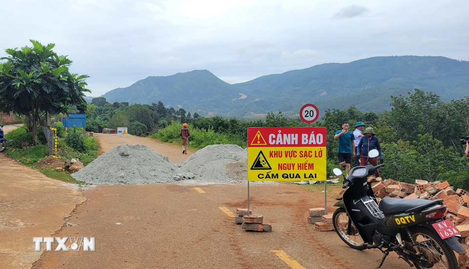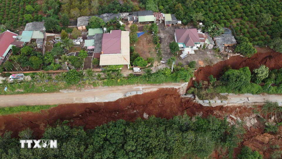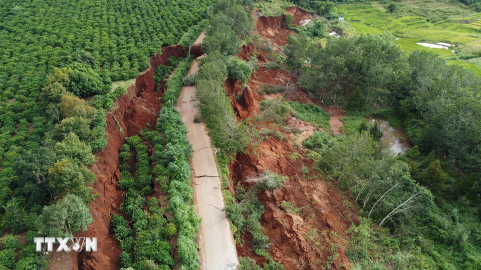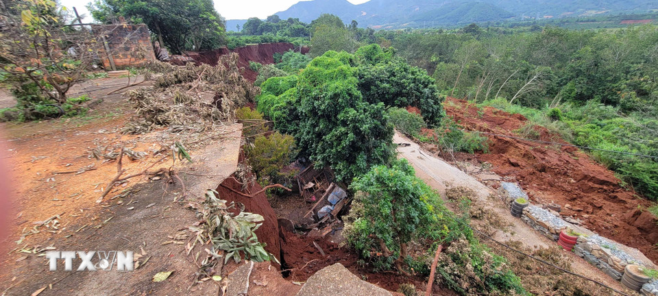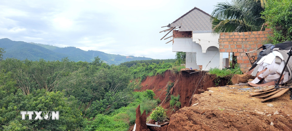 Tuyến đường sạt lở nghiêm trọng làm sập nhà dân. (Ảnh: Hoài Nam/TTXVN)