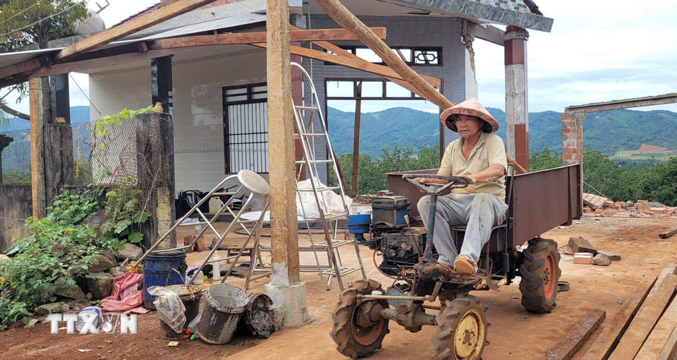 Gia đình ông Lê Văn Yên, trú Tổ 1, xã Ia Ly (Gia Lai) di chuyển tài sản sau khi căn nhà bị sập do sạt lở gây ra. (Ảnh: Hoài Nam/TTXVN)