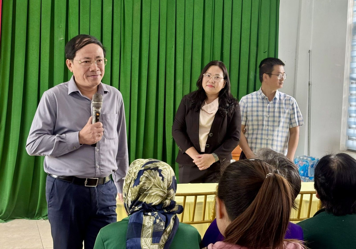 Chủ tịch UBND tỉnh Gia Lai Phạm Anh Tuấn (bên trái ảnh) chia sẻ, động viên với bà con bị thiệt hại do bão lũ.