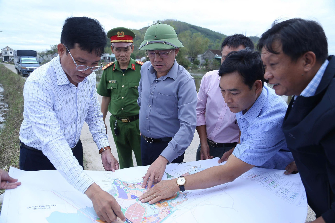 Chủ tịch UBND tỉnh Gia Lai Phạm Anh Tuấn (giữa) kiểm tra quy hoạch TĐC vùng thiên tai của xã Tuy Phước Tây.