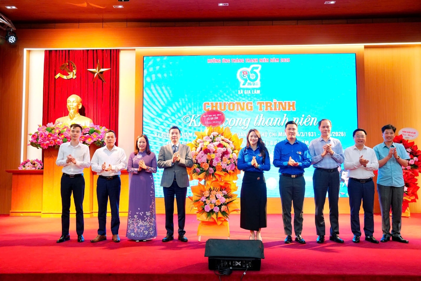 Các đồng chí lãnh đạo xã tặng hoa chúc mừng Đoàn TNCS Hồ Chí Minh xã Gia Lâm. Ảnh: Hoàng Anh