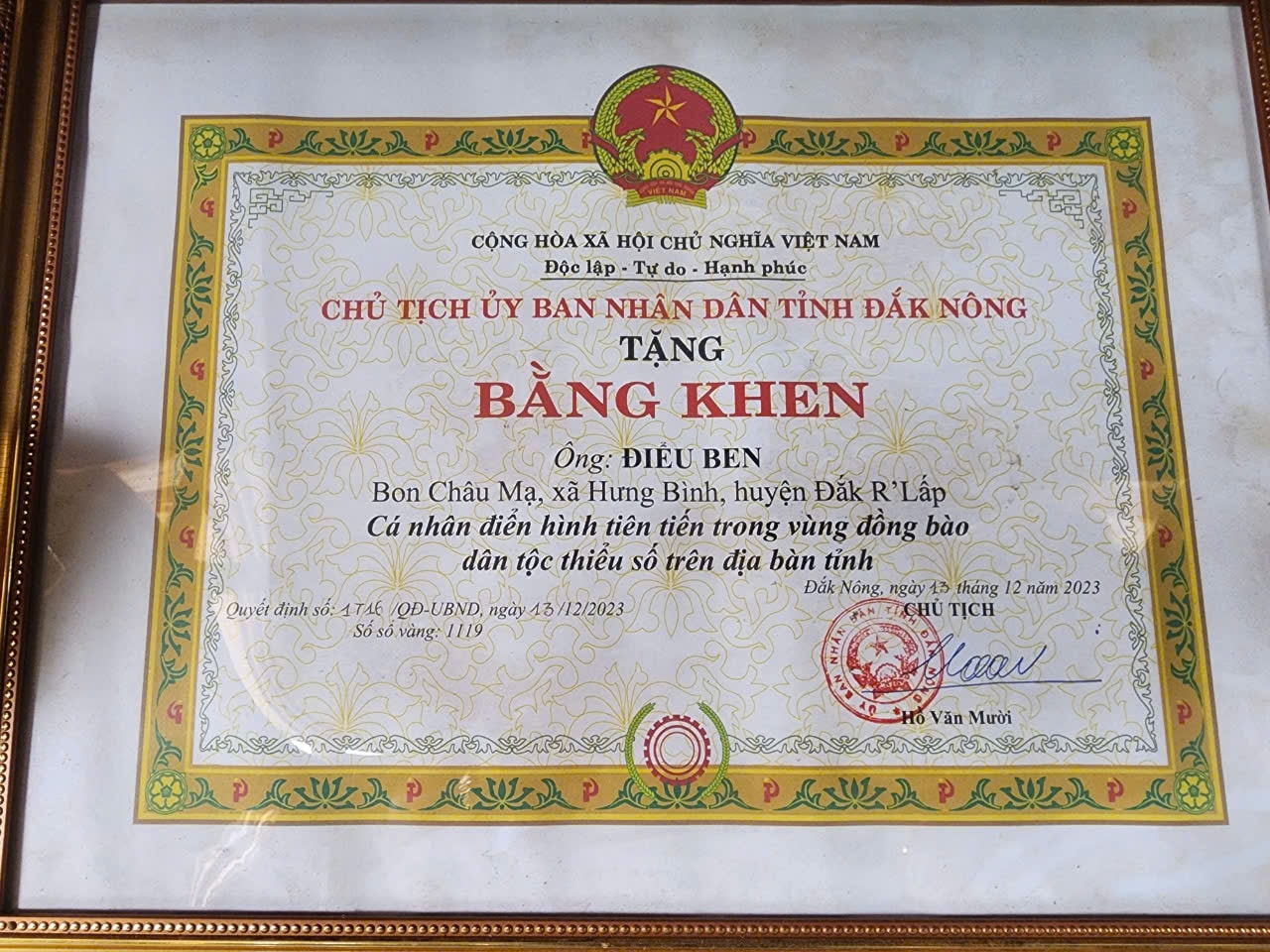 Với những đóng góp của mình, năm 2023 già làng Điểu Ben được Chủ tịch UBND tỉnh tặng bằng khen