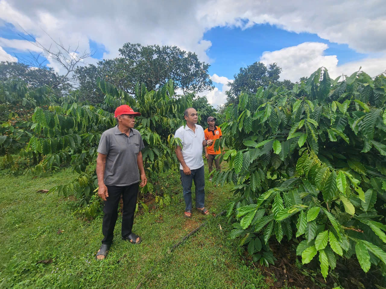 Già làng Điểu Ben (ngoài cùng bên trái) thăm hỏi, động viên người dân tích cực lao động sản xuất