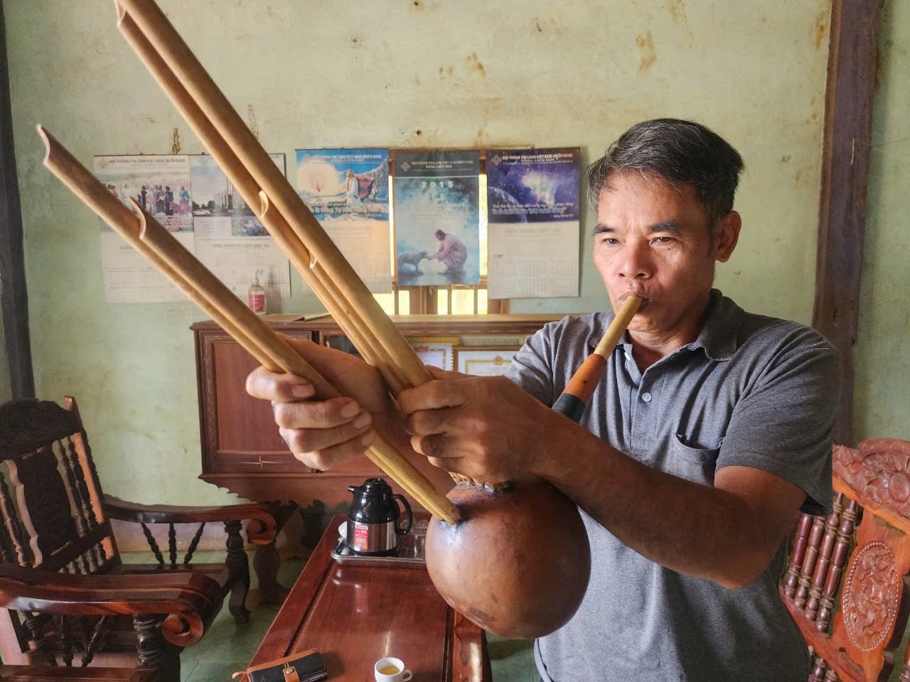 Già làng Điểu Ben còn là nghệ nhân thổi khèn bầu 6 ống rất giỏi trên địa bàn xã Quảng Tín