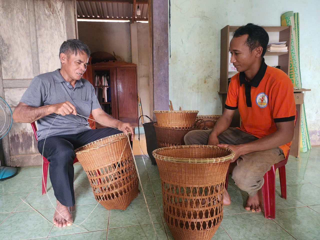 Già làng Điểu Ben hướng dẫn thế hệ trẻ cách đan gùi, giữ gìn nghề thủ công người M'nông