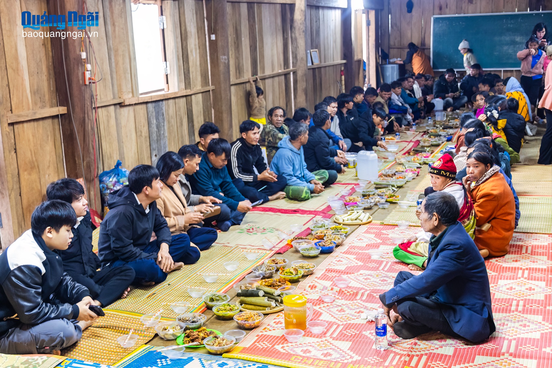 Người dân thôn Kon Chênh, đại biểu và du khách thưởng thức ẩm thực truyền thống của người Mơ Nâm tại Nhà rông văn hóa thôn trong Ngày hội Đại đoàn kết toàn dân tộc.
