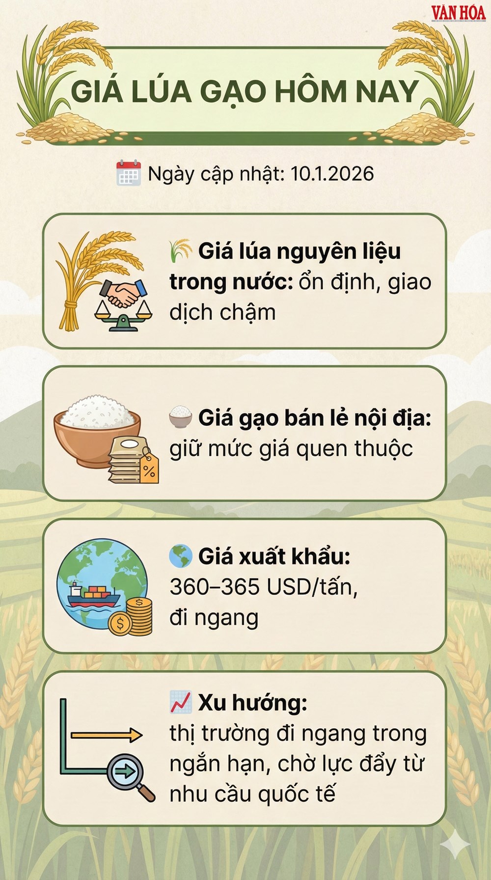 Tổng thể thị trường lúa gạo ngày 10.1 cho thấy xu hướng ổn định là chủ đạo. Trong ngắn hạn, giá lúa gạo nhiều khả năng tiếp tục đi ngang, biên độ dao động hẹp khi thị trường chờ thêm tín hiệu rõ ràng từ xuất khẩu và tiến độ thu hoạch vụ Đông Xuân.
