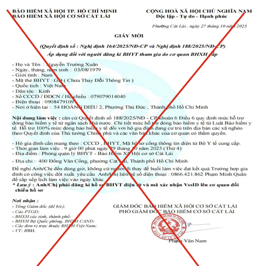 Mới đây, tiếp tục xuất hiện “Giấy mời” có đóng dấu đỏ và chữ ký giả mạo lãnh đạo BHXH. Văn bản ghi căn cứ “Nghị định 164, 188-2025” và mời đến cơ quan BHXH để “được hỗ trợ mức đóng BHYT và hoàn trả 50% chi phí khám chữa bệnh do ảnh hưởng bão Yagi”. “Giấy mời” giả này cũng yêu cầu mang theo CCCD gắn chip, hồ sơ BHYT và cung cấp “mã hồ sơ cổng thông tin Bộ Y tế”. Đây là dấu hiệu rõ ràng của hành vi thu thập dữ liệu cá nhân trái phép. Ngoài ra, việc sử dụng văn bản giả để lừa đảo, khiến nhiều người mất cảnh giác.