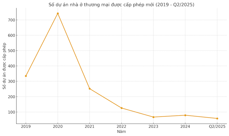 Nếu năm 2020 cả nước có 743 dự án được cấp phép, thì đến năm 2021 con số ấy giảm còn 252, bằng 34% năm trước. Đà giảm tiếp tục kéo dài: năm 2022 còn 126 dự án, năm 2023 chỉ còn 67, năm 2024 đạt 79, và chỉ có 58 dự án được cấp phép trong nửa đầu năm 2025. So với đỉnh năm 2020, quy mô cấp phép hiện nay đã giảm hơn 12 lần — phản ánh tình trạng trì trệ kéo dài của thị trường nhà ở thương mại.