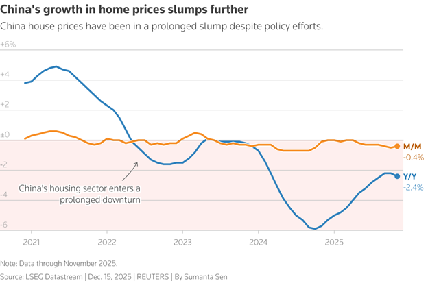 Theo tính toán của Reuters dựa trên dữ liệu của Cục Thống kê Quốc gia Trung Quốc, giá nhà đã giảm 0,4% so với tháng trước, so với mức giảm 0,5% trong tháng 10. Tính theo cùng kỳ năm ngoái, giá nhà giảm 2,4% trong tháng 11, mạnh hơn mức giảm 2,2% của tháng 10.