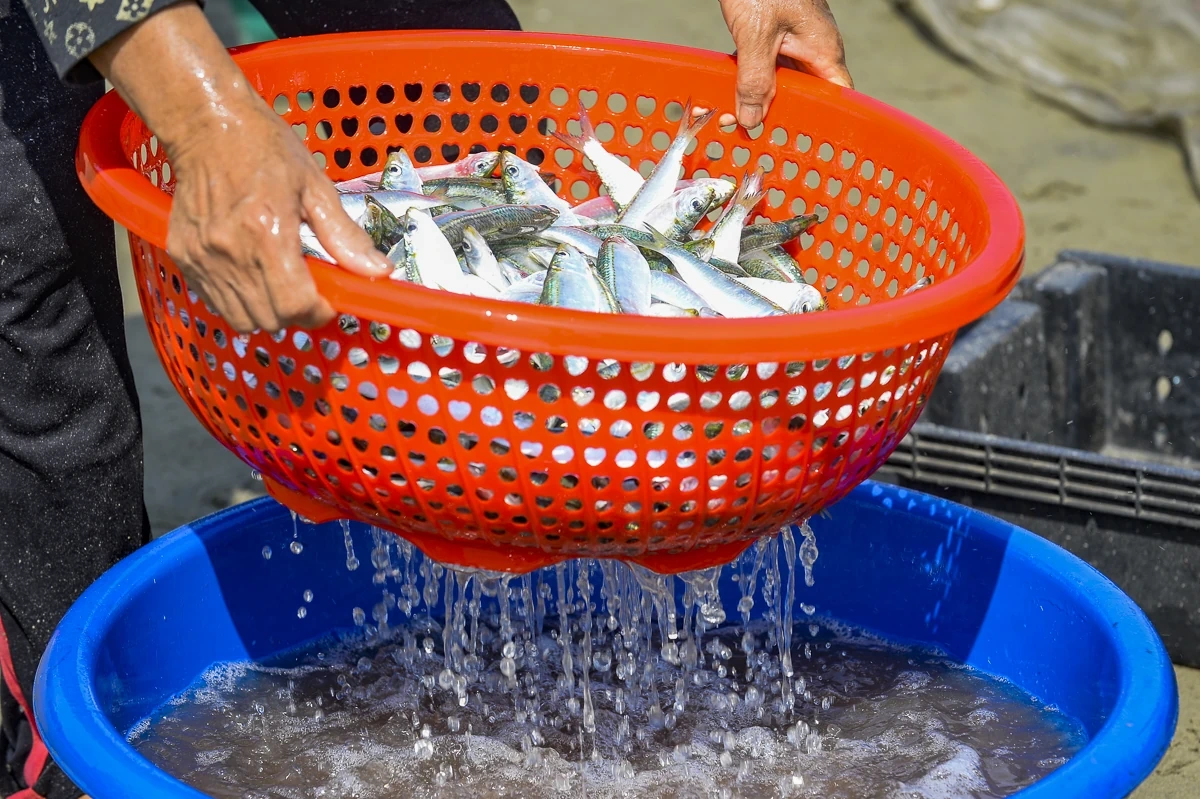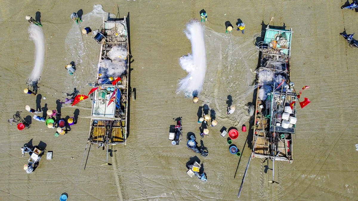 Những tấm lưới sạch trải trên cát trắng, từng mẻ cá ánh bạc tươi rói liên tục được thu gom trong tiếng gọi nhau í ới.