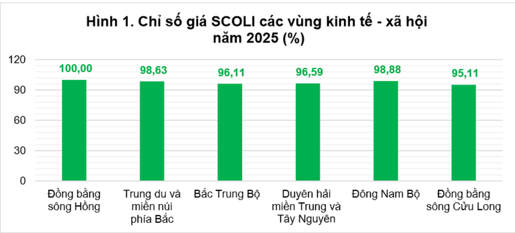 Như vậy, khoảng cách giữa vùng có mức giá cao nhất và thấp nhất ở mức 4,89 điểm phần trăm, phản ánh sự chênh lệch không lớn về chi phí sinh hoạt giữa các vùng.