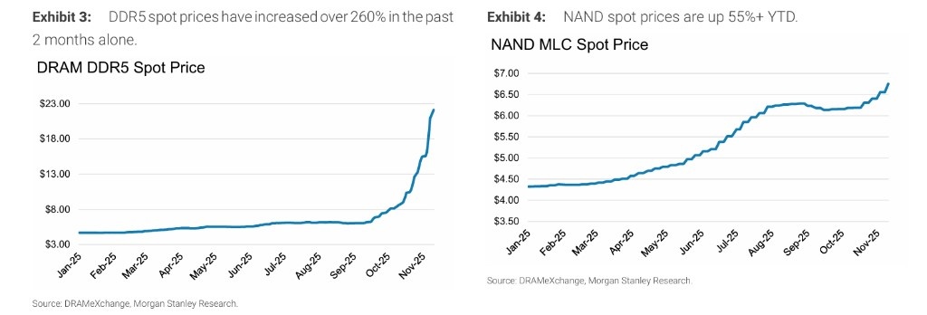 Giá chip nhớ trong năm nay được so sánh "tăng nhanh hơn giá vàng". Ảnh: Morgan Stanley.