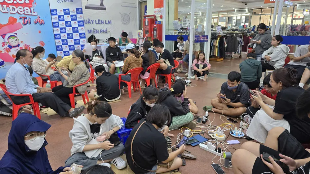 Điểm tụ tập đông nhất được ghi nhận là tại siêu thị Co.op Mart Quy Nhơn có hàng nghìn người đến sạc pin.