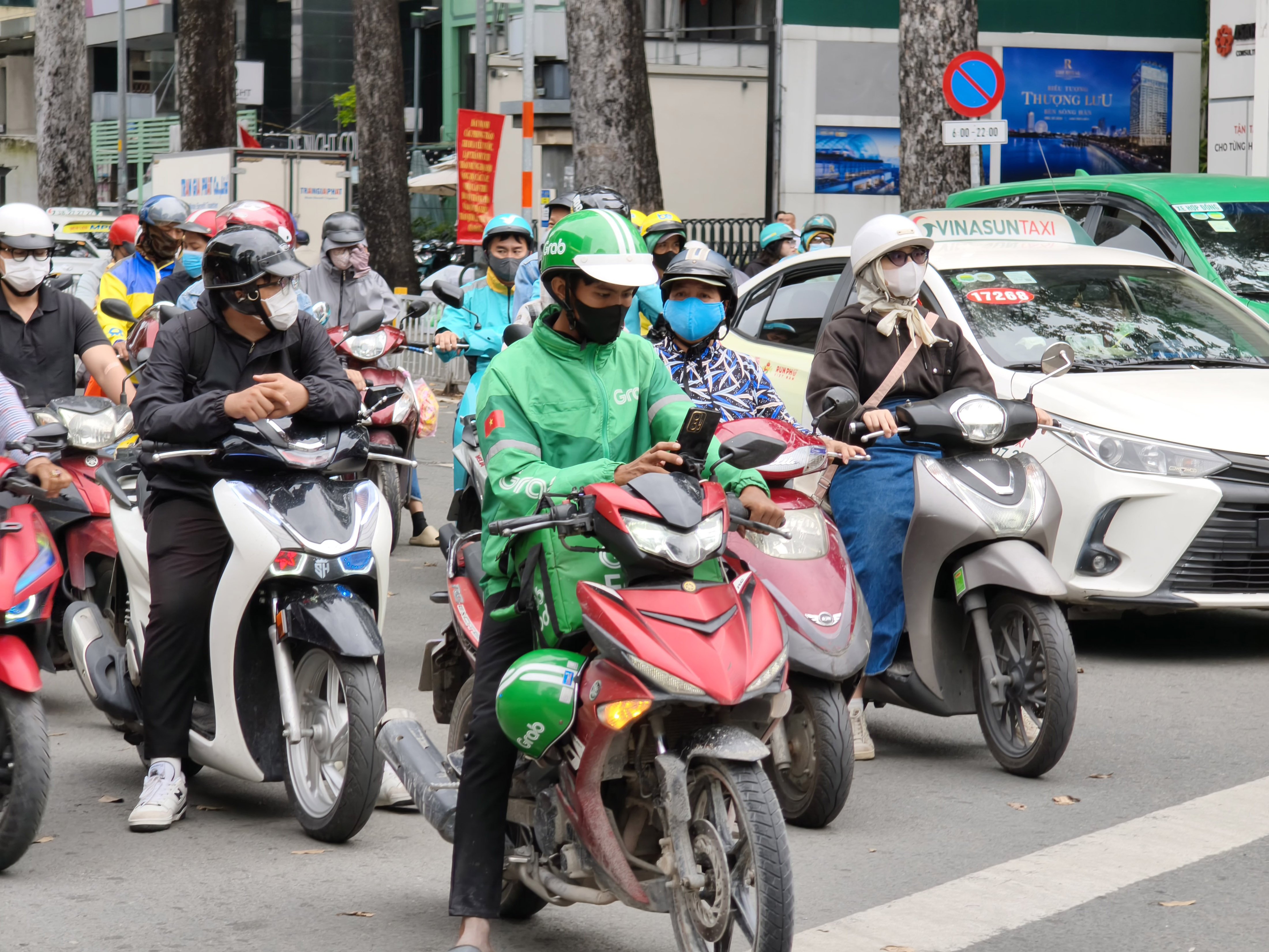 Người dân TPHCM đeo khẩu trang ra đường để bảo vệ sức khỏe trước ô nhiễm không khí (ảnh chụp tại giao lộ Nguyễn Thị Minh Khai - Cống Quỳnh, phường Cầu Ông Lãnh, TPHCM) Ảnh: HOÀNG HÙNG