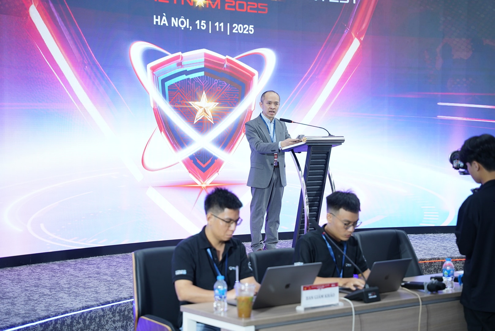 Thiếu tướng Lê Xuân Minh, Cục trưởng Cục A05 phát biểu khai mạc sự kiện Ngày hội Sinh viên và chung khảo cuộc thi sinh viên với an ninh mạng 2025. Ảnh: BTC