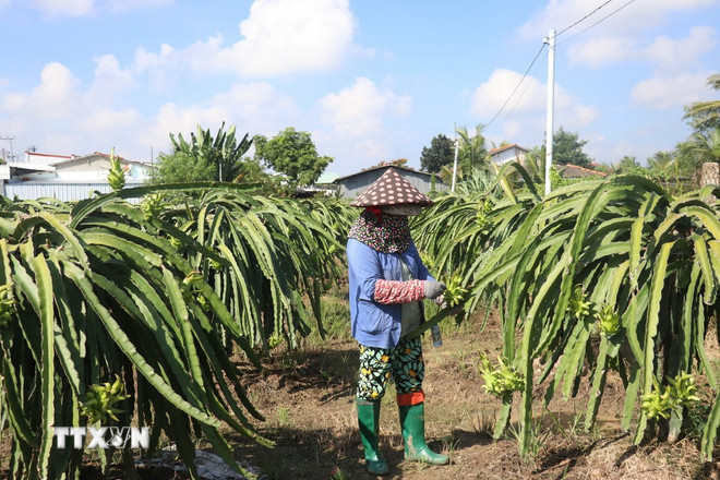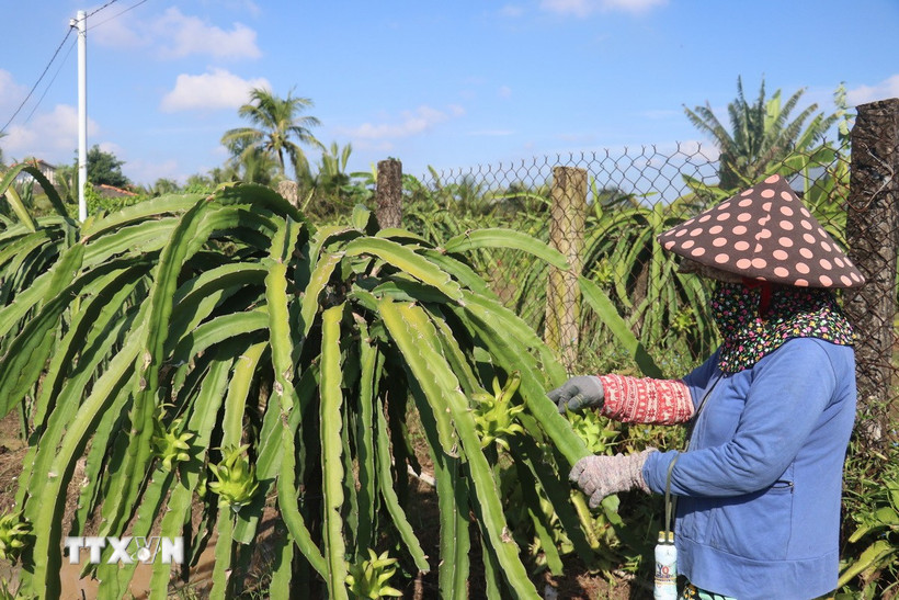 Nhà vườn xã Tân Thuận Bình, tỉnh Đồng Tháp chăm sóc thanh long. (Ảnh: Công Trí/TTXVN)