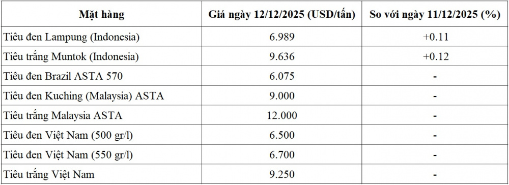 Trên thị trường thế giới, dựa trên báo giá của các doanh nghiệp xuất khẩu và giá xuất cảng tại các nước, Hiệp hội Hồ tiêu Quốc tế (IPC) cập nhật giá tiêu mới nhất tính đến ngày 12/12/2025 giảm nhẹ so với cuối tuần trước. Cụ thể như sau: