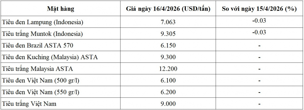 Trên thị trường thế giới, dựa trên báo giá của các doanh nghiệp xuất khẩu và giá xuất cảng tại các nước, Hiệp hội Hồ tiêu Quốc tế (IPC) cập nhật giá tiêu mới nhất tính đến ngày 16/4/2026 giảm nhẹ so với hôm qua. Cụ thể như sau:
