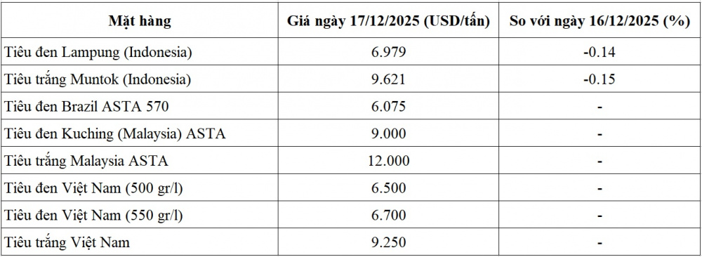Trên thị trường thế giới, dựa trên báo giá của các doanh nghiệp xuất khẩu và giá xuất cảng tại các nước, Hiệp hội Hồ tiêu Quốc tế (IPC) cập nhật giá tiêu mới nhất tính đến ngày 17/12/2025 giảm nhẹ so với hôm qua. Cụ thể như sau: