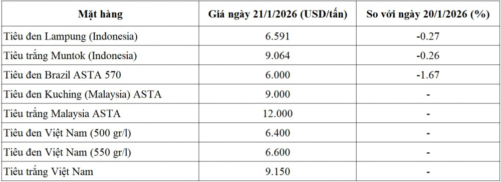 Trên thị trường thế giới, dựa trên báo giá của các doanh nghiệp xuất khẩu và giá xuất cảng tại các nước, Hiệp hội Hồ tiêu Quốc tế (IPC) cập nhật giá tiêu mới nhất tính đến ngày 21/1/2026 giảm nhẹ so với hôm qua. Cụ thể như sau: