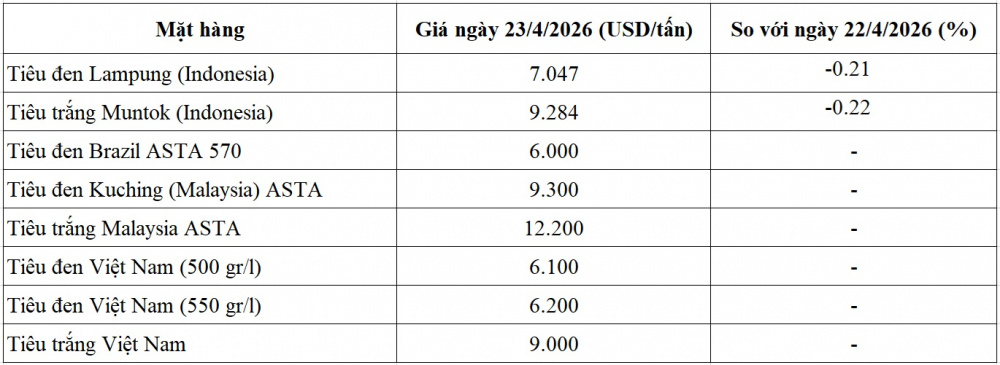 Trên thị trường thế giới, dựa trên báo giá của các doanh nghiệp xuất khẩu và giá xuất cảng tại các nước, Hiệp hội Hồ tiêu Quốc tế (IPC) cập nhật giá tiêu mới nhất tính đến ngày 23/4/2026 giảm nhẹ so với hôm qua. Cụ thể như sau:
