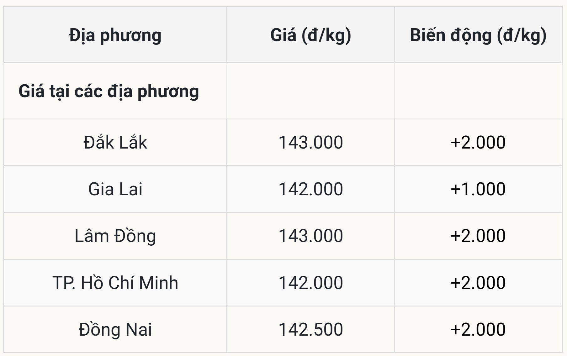 TP Hồ Chí Minh và Đồng Nai cùng có mức tăng 2.000 đồng/kg, đưa giá lên 144.000 đồng/kg.