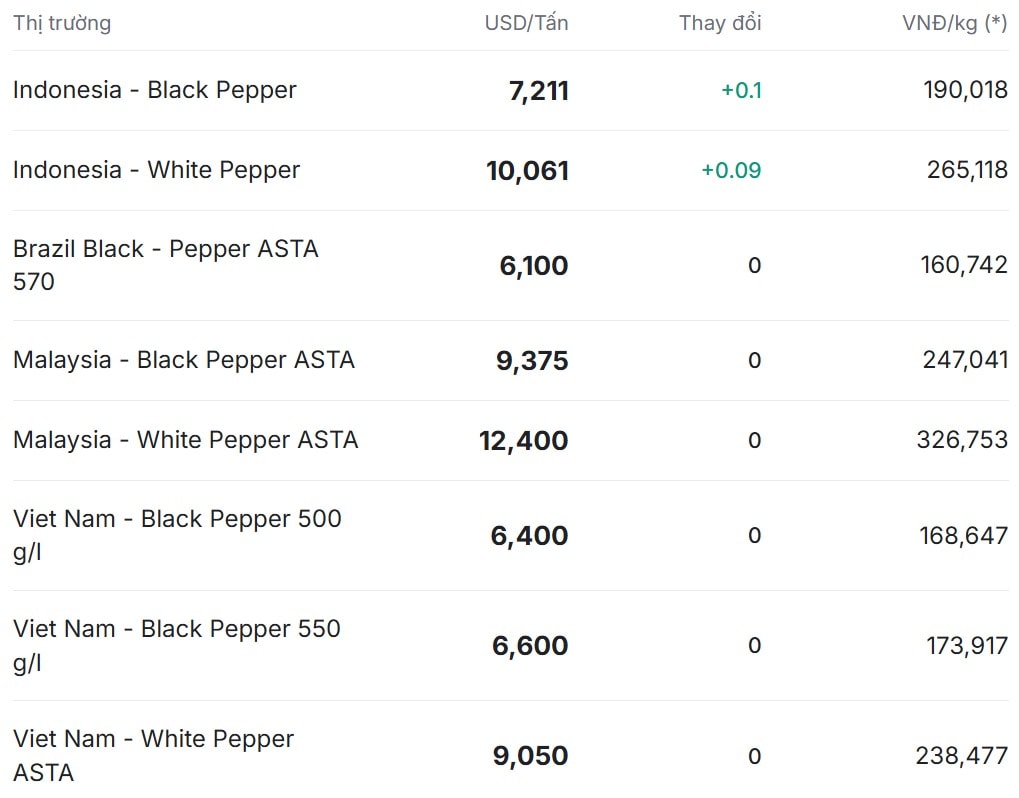 Trên thị trường thế giới, giá tiêu phần lớn ổn định trong phiên giao dịch mới nhất. Riêng sàn giao dịch Indonesia - một trong những thị trường sôi động nhất lại ghi nhận mức tăng nhẹ với tiêu đen tăng 0.1% và tiêu trắng tăng 0.09%. Hiện hai mặt hàng này giao dịch trong khoảng 7.211 - 10.061 USD/tấn (tương đương với 190.018 VND/kg - 265.118 VND/kg).