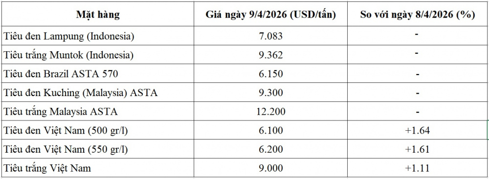 Trên thị trường thế giới, dựa trên báo giá của các doanh nghiệp xuất khẩu và giá xuất cảng tại các nước, Hiệp hội Hồ tiêu Quốc tế (IPC) cập nhật giá tiêu mới nhất tính đến ngày 9/4/2026 ổn định so với hôm qua. Cụ thể như sau: