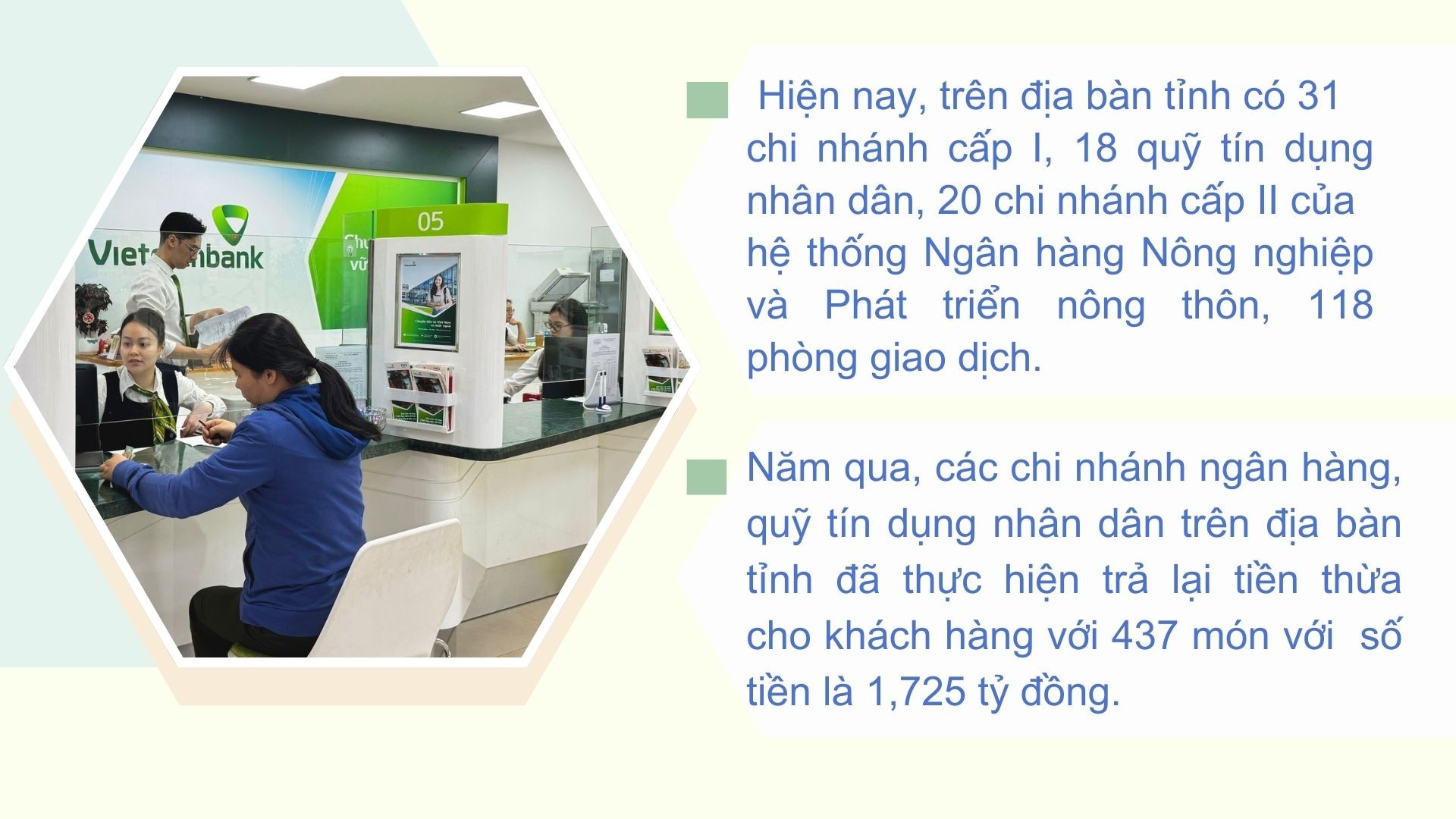 Trong năm qua, các chi nhánh ngân hàng, quỹ tín dụng nhân dân trên địa bàn tỉnh đã thực hiện trả lại tiền thừa cho khách hàng với 437 món, số tiền thừa là 1,725 tỷ đồng. Hành động trả lại tiền thừa, dù số tiền lớn hay nhỏ đều xứng đáng được tôn vinh. Đó chính là biểu hiện rõ nét nhất của đạo đức nghề nghiệp, khẳng định rằng ở nơi vốn chỉ có những con số khô khan hiển thị trên màn hình điện tử, giá trị của lòng trung thực vẫn luôn được đặt lên hàng đầu.