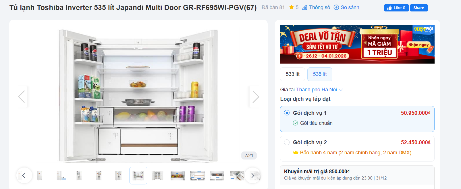 Với mức giá chỉ từ 5,09 triệu đồng, tủ lạnh Inverter không còn là lựa chọn đắt đỏ đối với các gia đình trẻ, người mua lần đầu hoặc những ai cần thay thế tủ lạnh cũ trước Tết. Trong khi đó, các mẫu tủ lạnh Toshiba dung tích từ 300 lít trở lên, vốn có giá niêm yết khá cao, nay được giảm sâu tới vài triệu đồng, tạo ra khoảng chênh lệch đáng kể so với thời điểm giữa năm. Điều này giúp người tiêu dùng có cơ hội “lên đời” tủ lạnh lớn hơn mà không phải tăng ngân sách quá nhiều.