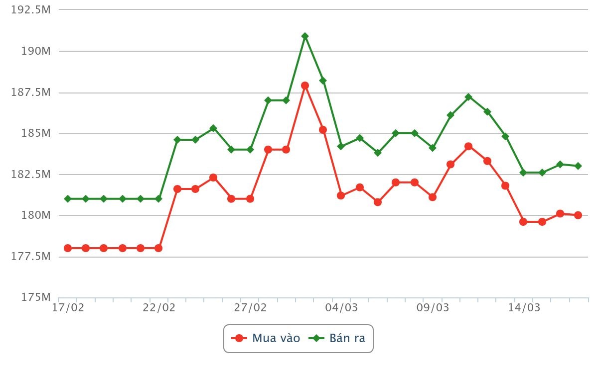 Tại SJC, mức niêm yết tiếp chốt phiên ngày 17/3/2026 ở mức 180,0 – 183,0 triệu đồng/lượng. So với phiên trước đó, giá mua vào và bán ra đều giảm 100 nghìn đồng/lượng, giữ chênh lệch ở mức 3 triệu đồng. Diễn biến này cho thấy thị trường vẫn đang trong trạng thái giằng co nhẹ, chưa hình thành xu hướng rõ ràng.