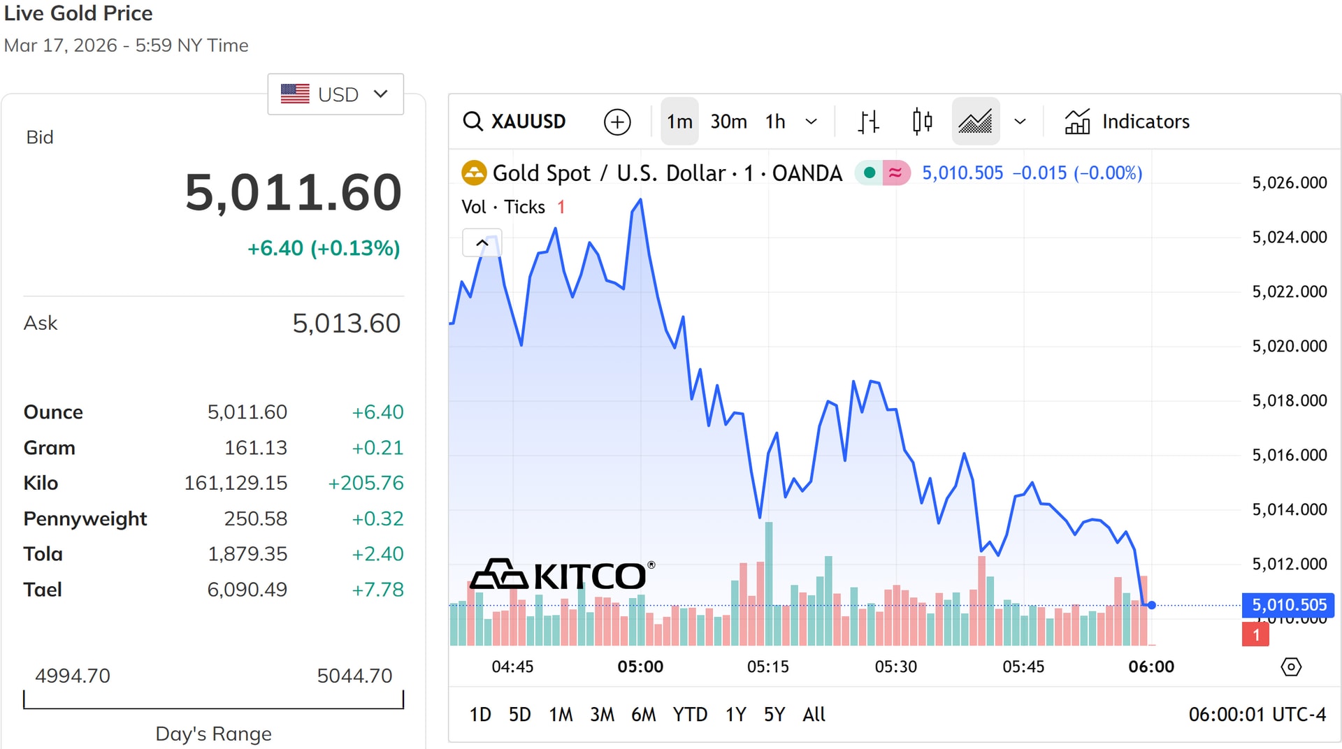 Giá vàng thế giới phiên chiều hôm nay 17/3/2026 tiếp tục dao động quanh mốc 5.000 USD/ounce
