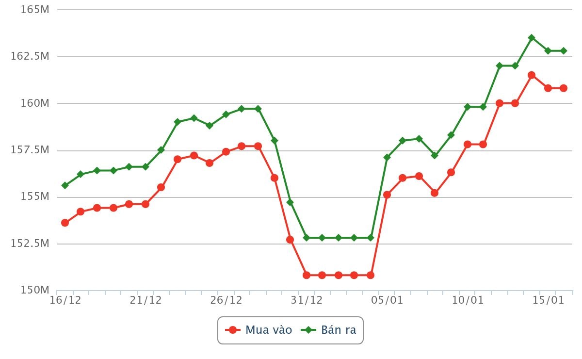 Cùng thời điểm, Công ty Cổ phần Vàng bạc Đá quý Phú Nhuận (PNJ) đang chốt phiên giá vàng miếng với mức 160,8 triệu đồng/lượng ở chiều mua vào và 162,8 triệu đồng/lượng ở chiều bán ra. Chênh lệch mua – bán tại PNJ vẫn duy trì ở mức 2 triệu đồng/lượng.