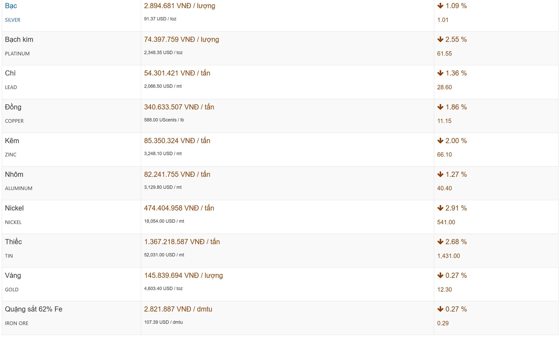 Giá nhôm giảm 1,27% so với phiên giao dịch trước, xuống còn 82.241.755 VNĐ/tấn, tương ứng mức giảm 40,40 USD, hiện đứng tại 3.129,80 USD/mt.